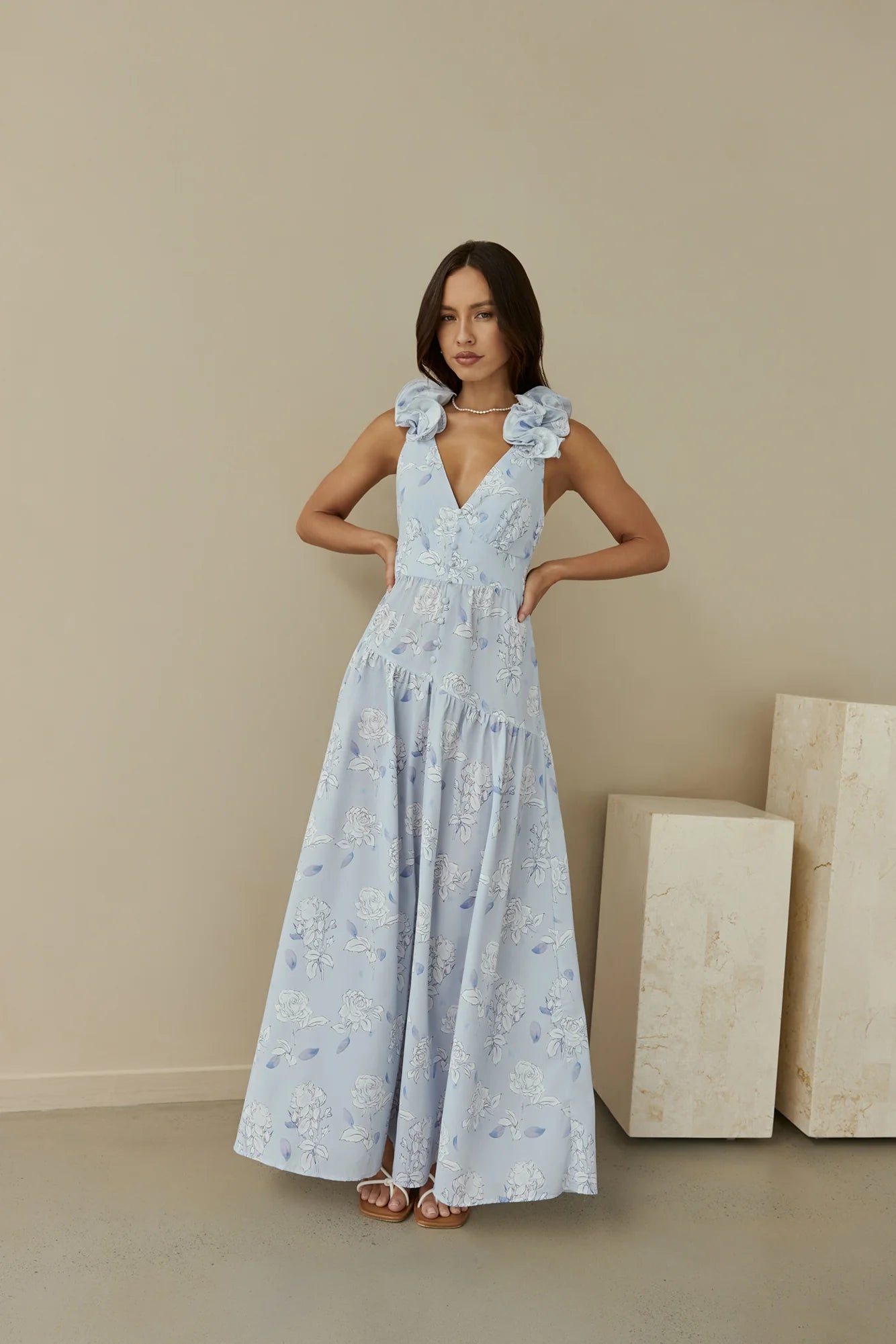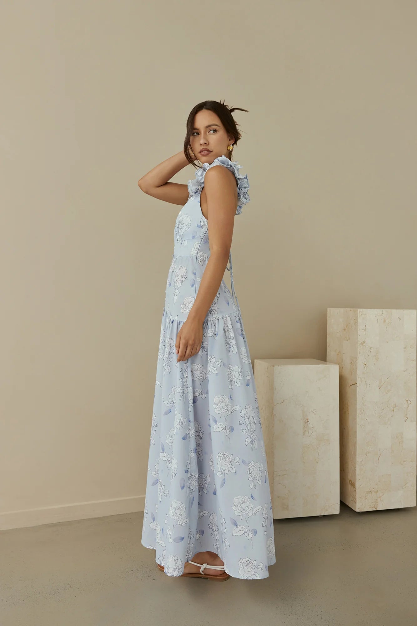 The Pretty Smile Maxi Dress features a floral print with frill shoulder straps, a crisscross back, and a flowy skirt — the perfect blend of sweet and stylish for sunny days. Style with heels.