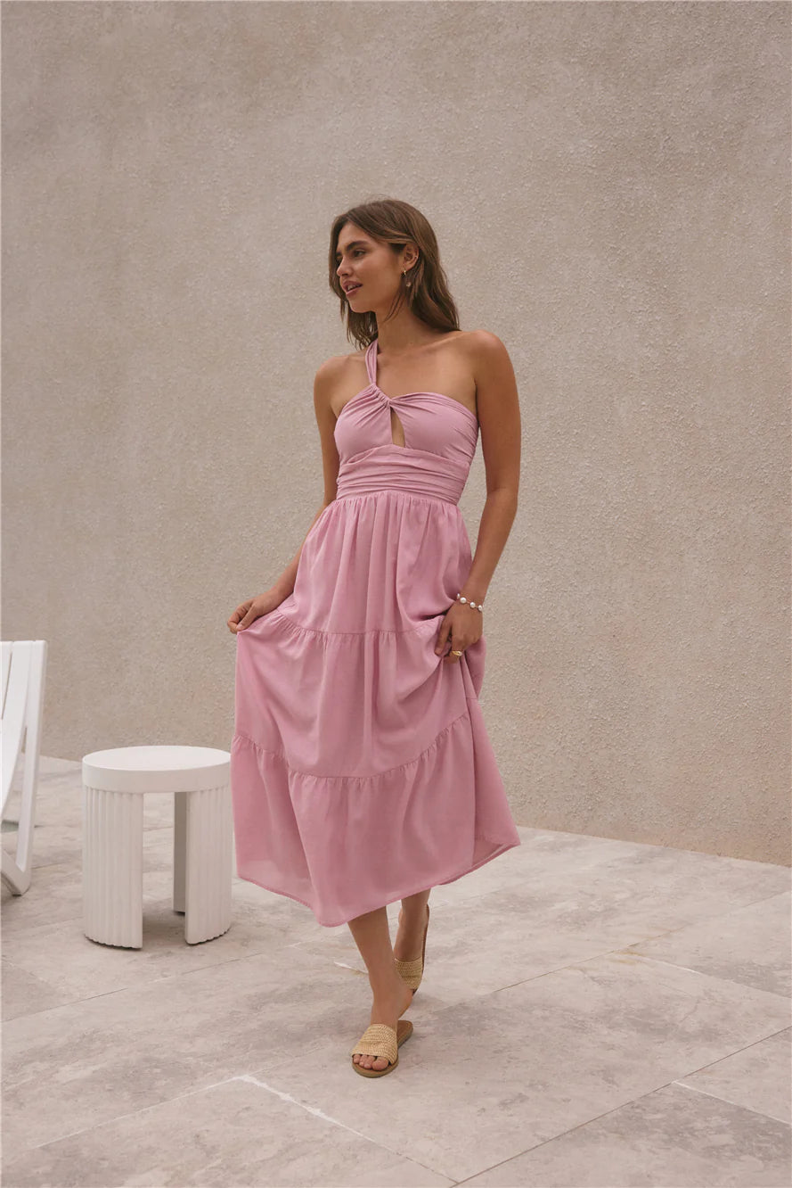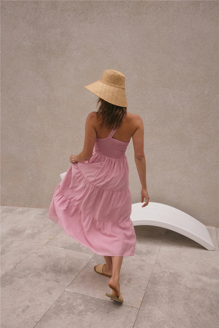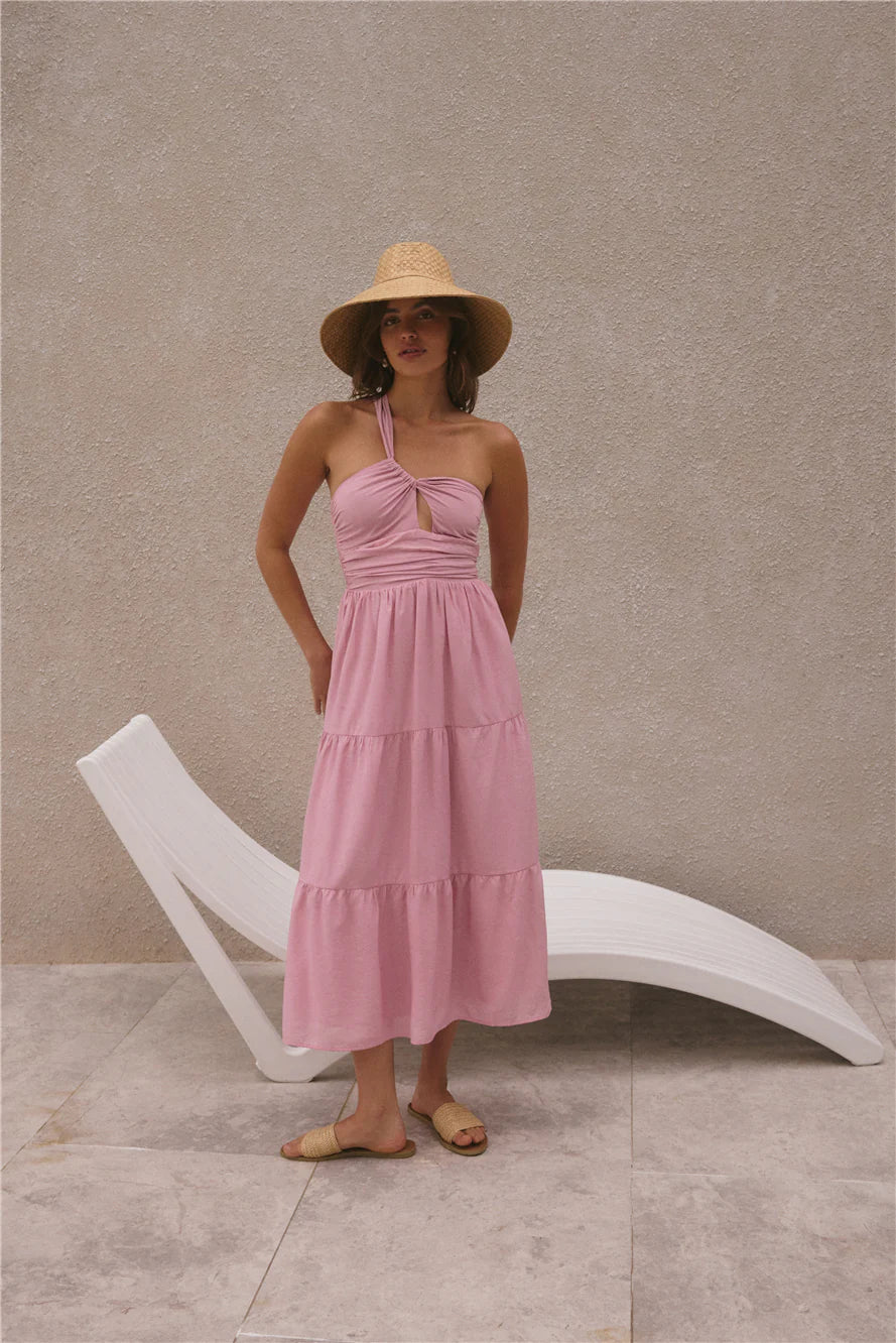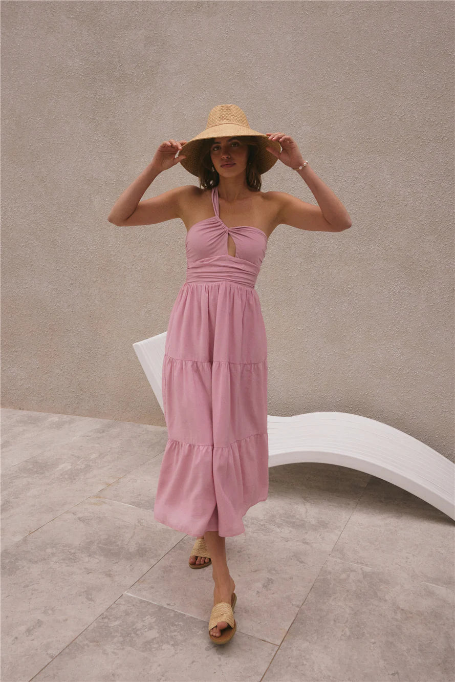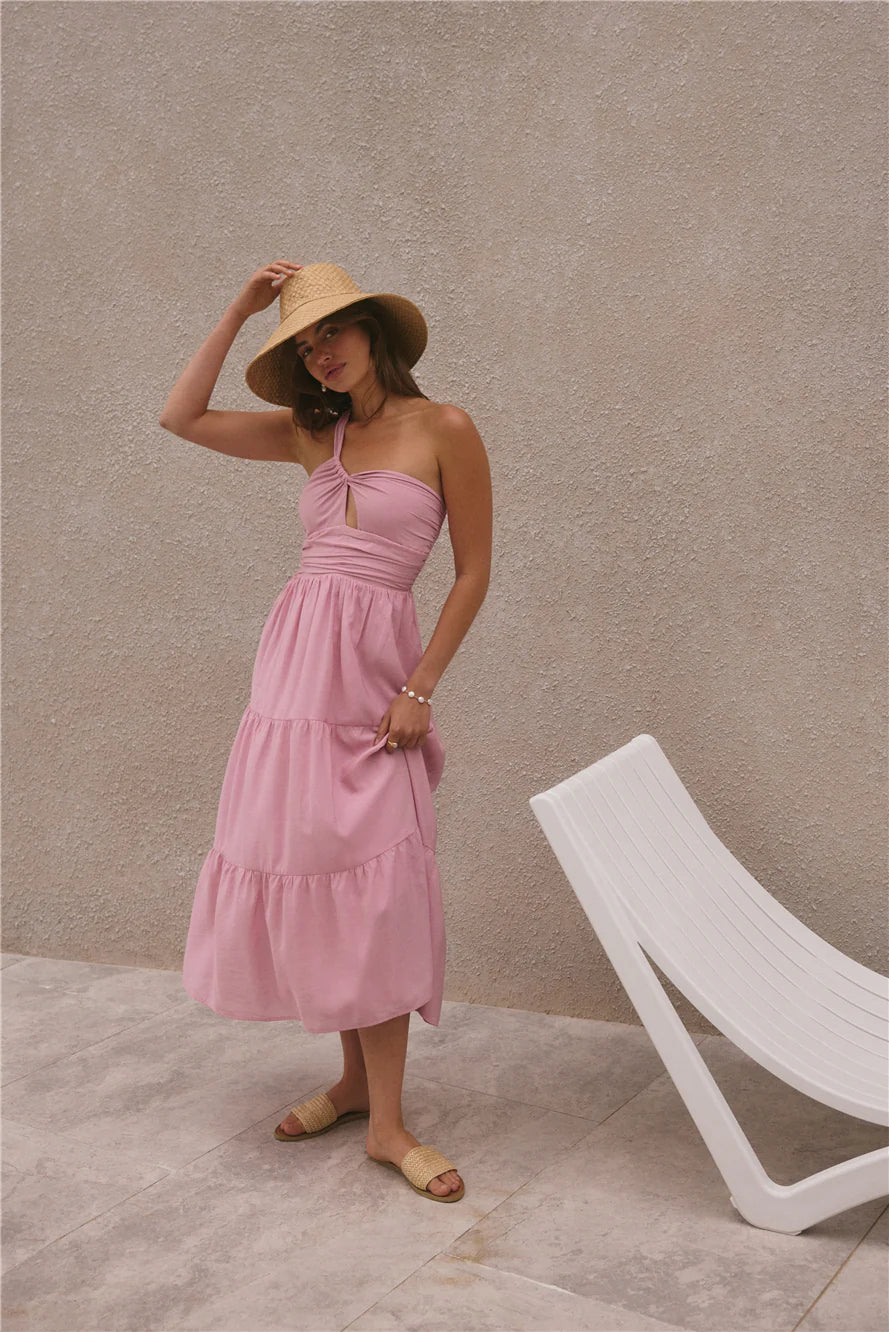 Feel the ocean breeze flow through you in the Pure Satisfaction One Shoulder Maxi Dress in Pink. With billowing features and textures that make you feel like you're floating, this dress makes for a perfect summer night companion no matter your agenda. Pair with white heels and hair slicked back to compliment the dress.