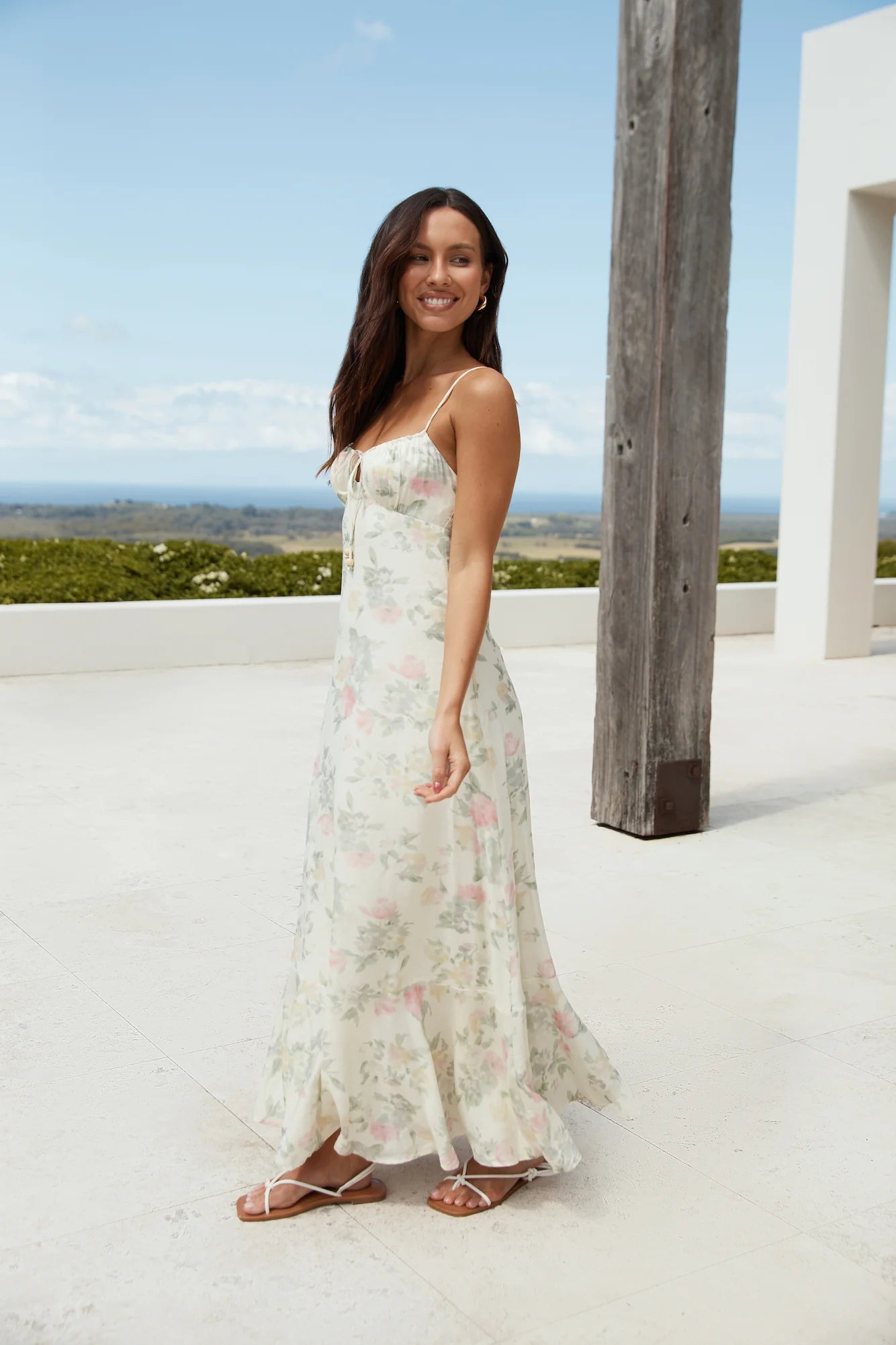 The Rebekah Foral Maxi Dress was made for those clear sky soirees This eye-catching, however subtle dress features a light floral pattern and a flowing design, perfect for sunny days and festive summer gatherings.
