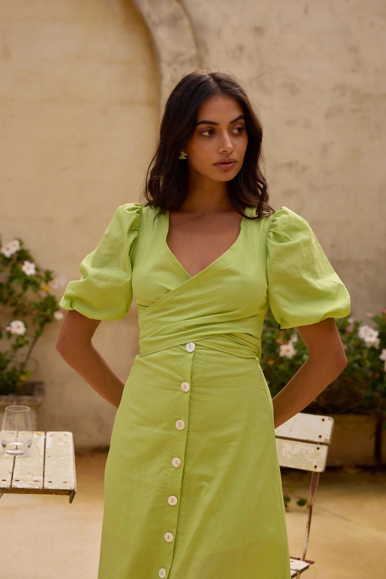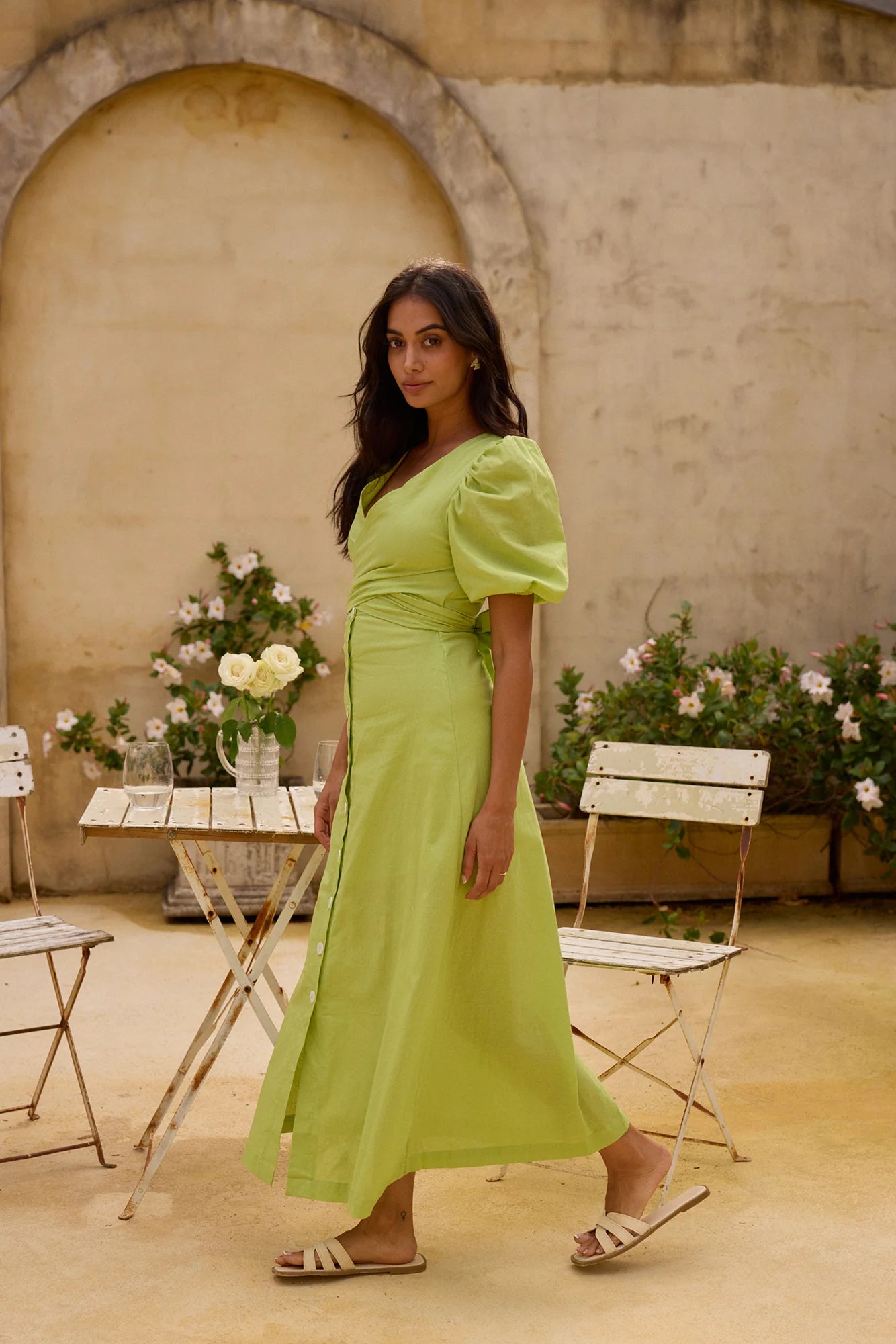 Introducing the Remi Rounds Maxi Dress in a stunning green hue, where dynamic design meets chic elegance. This dress features captivating wrapped detailing at the waist, accentuating your figure while adding an element of sophistication. The row of white buttons running down the center enhances its unique style, providing a delightful contrast that elevates the overall look. With its versatile design, the Remi Rounds Maxi Dress is perfect for both everyday wear and special occasions.
