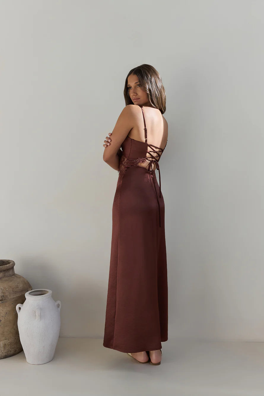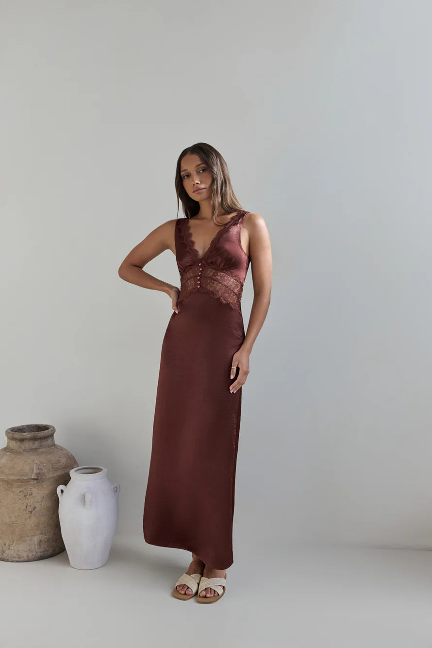 The Softly In Season Satin Maxi Dress brings elegance with its satin finish, delicate lace details, faux button front, sheer bodice, and a crisscross back — perfect for glowing golden moments. Style with heels.