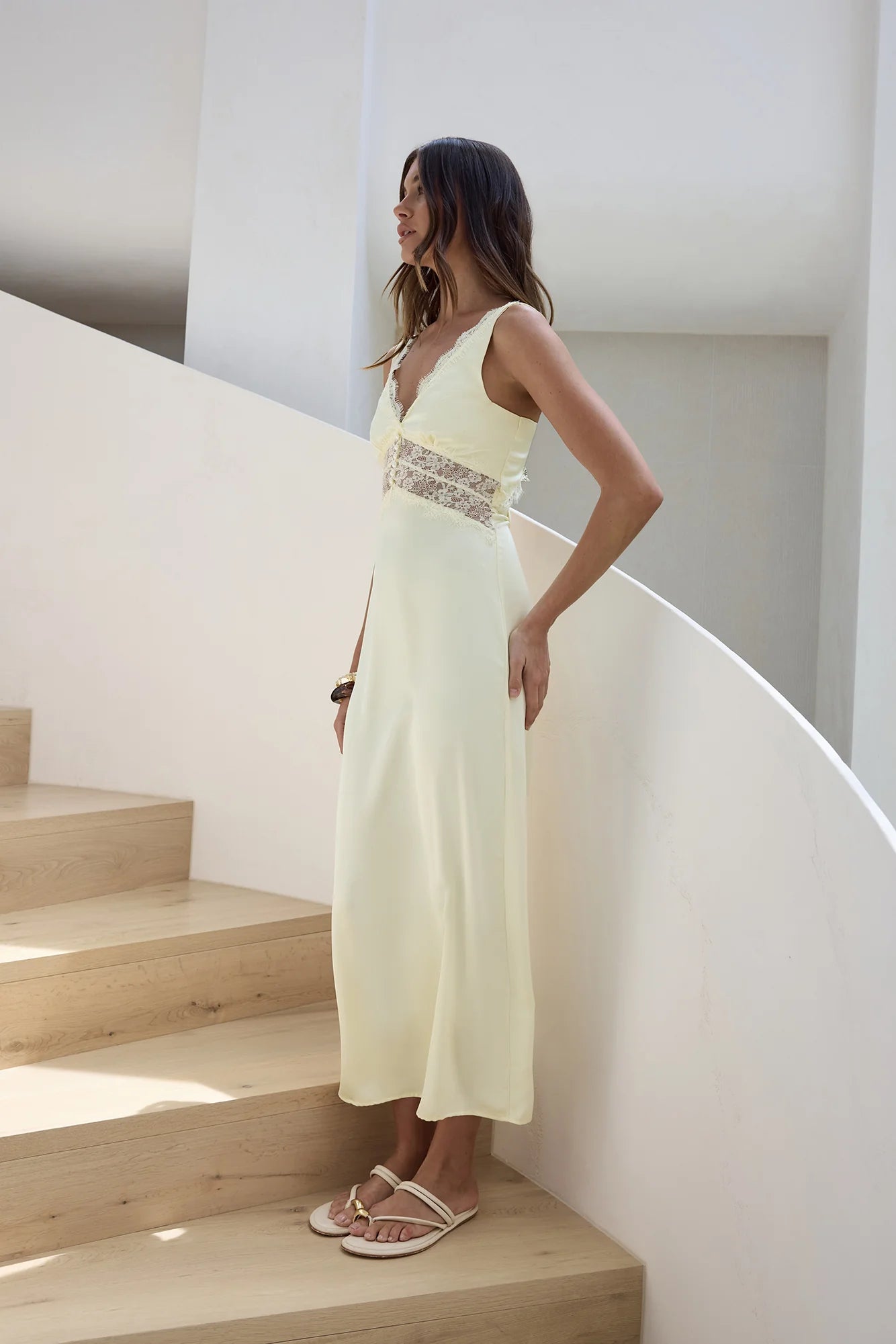 The Romantic One Satin Maxi Dress brings elegance with its satin finish, delicate lace details, faux button front, sheer bodice, and a crisscross back — perfect for glowing golden moments. Style with mules