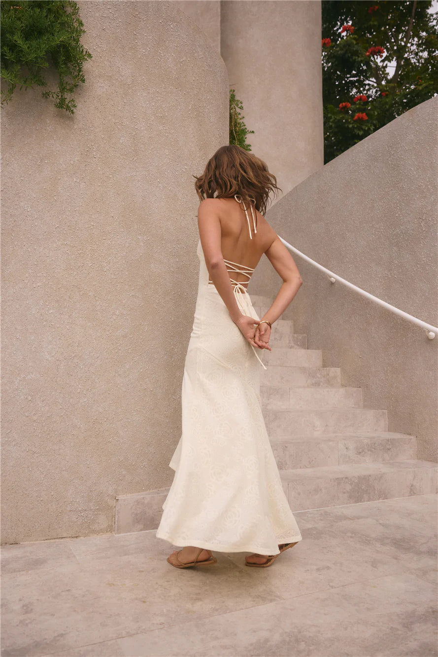 The Rosetta Halter Maxi Dress in Cream exudes romantic elegance and vibrant charm, perfect for strolling through the rose gardens of Portland or attending a summer wedding in the Hamptons. Embrace the beauty of summer with this stunning dress, designed to turn heads and capture hearts.
