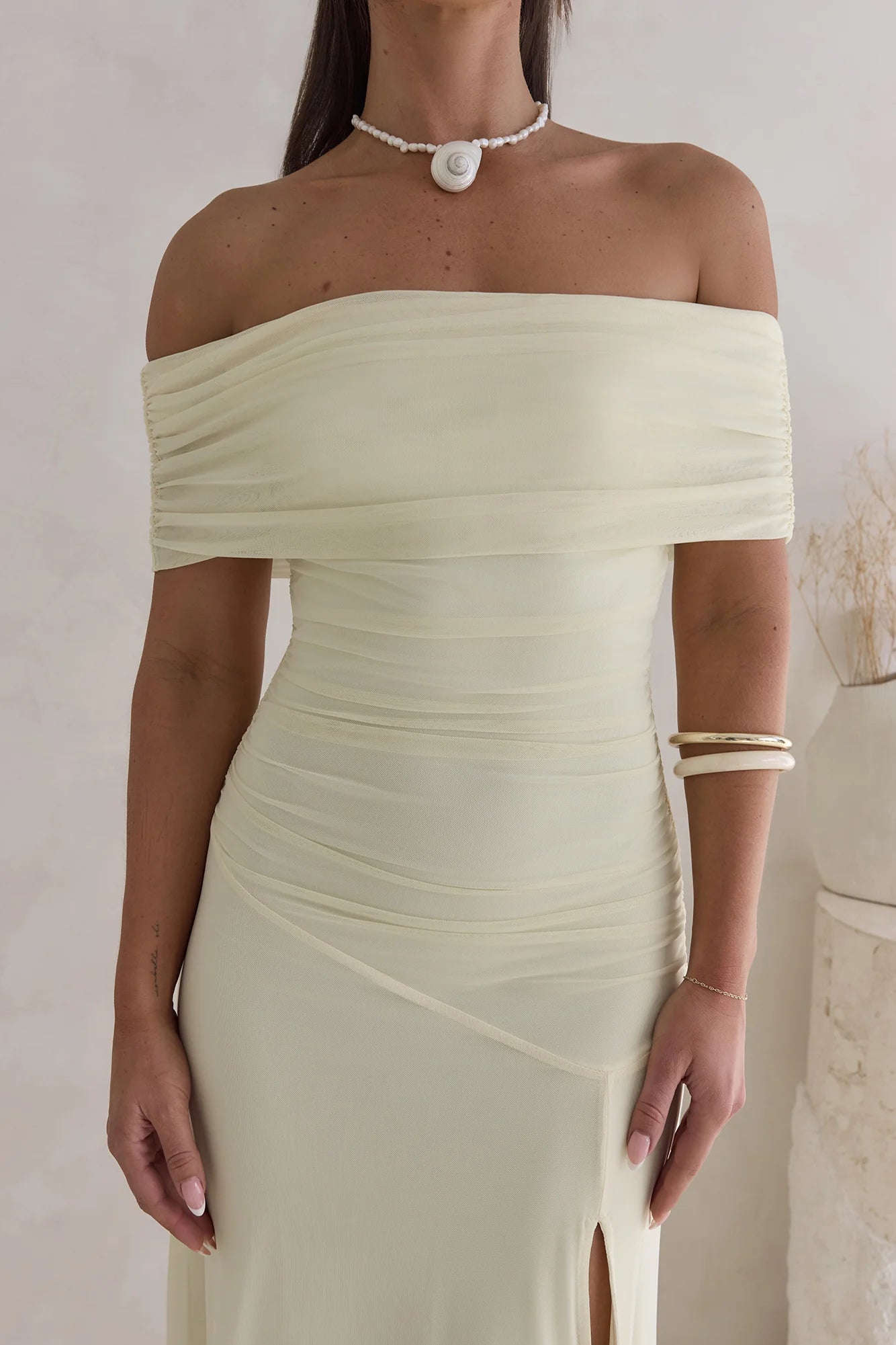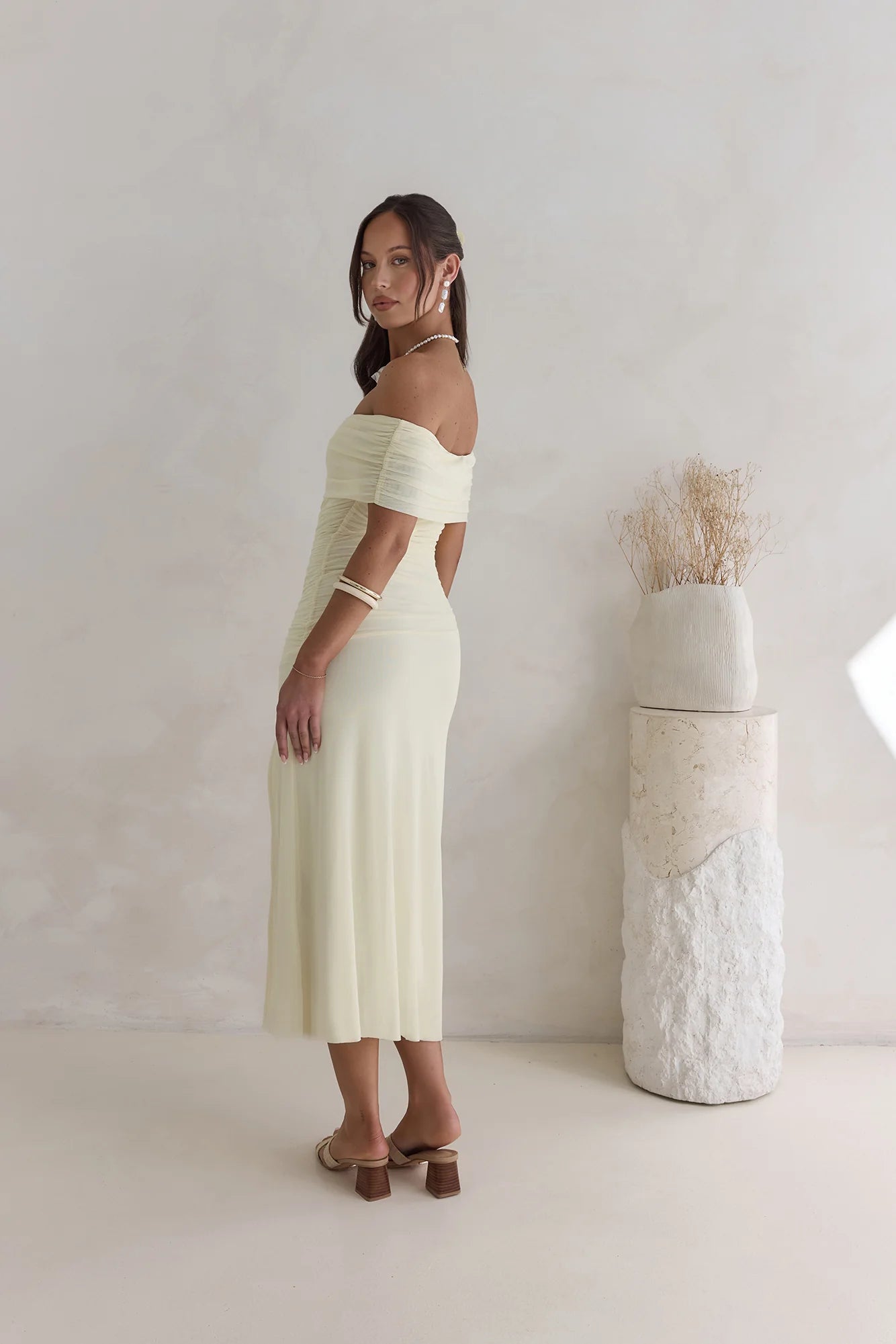 Bask in sunshine vibes with the Santorini Strolls Midi. Featuring a chic folded off-shoulder neckline, delicate mesh fabric, and a playful front split, this dress is your perfect partner for seaside escapes and summer celebrations.