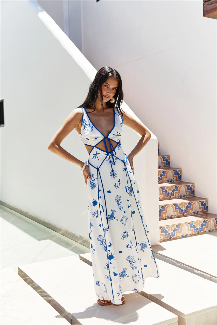Channel the essence of Mediterranean elegance with the Seaside Charm Cutout Maxi Dress in Blue. Featuring a delicate blue and white print reminiscent of Grecian art, this dress boasts a stunning cut-out bodice with adjustable tie details for a flattering, customized fit.