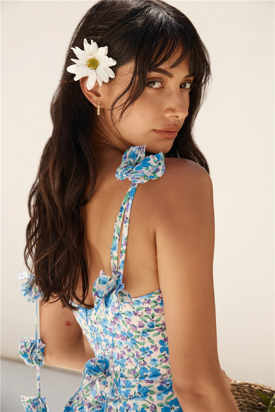 Step into a world of whimsical charm in the Seaside Escape Mini Dress in Blue. With stunning hues of blue and delicate floral features, this dress is sure to be the moment on your holiday getaway. Pair with white strappy heels and dainty gold adornments to complete the look.