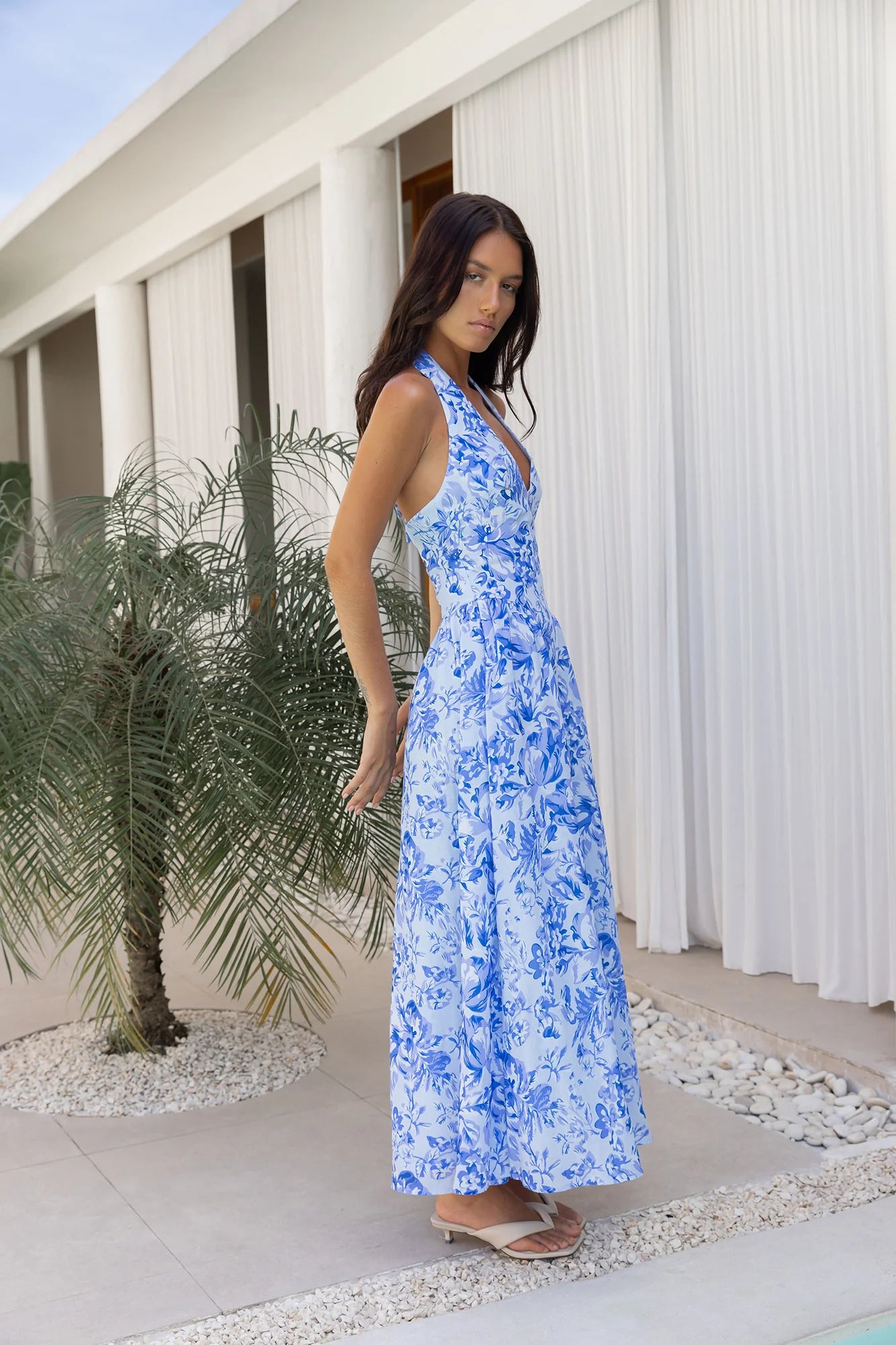 The Seaside Petals Halter Maxi Dress blooms with a flattering V-neck, flowy skirt, and delicate floral print—perfect for effortless elegance with a dreamy vibe.