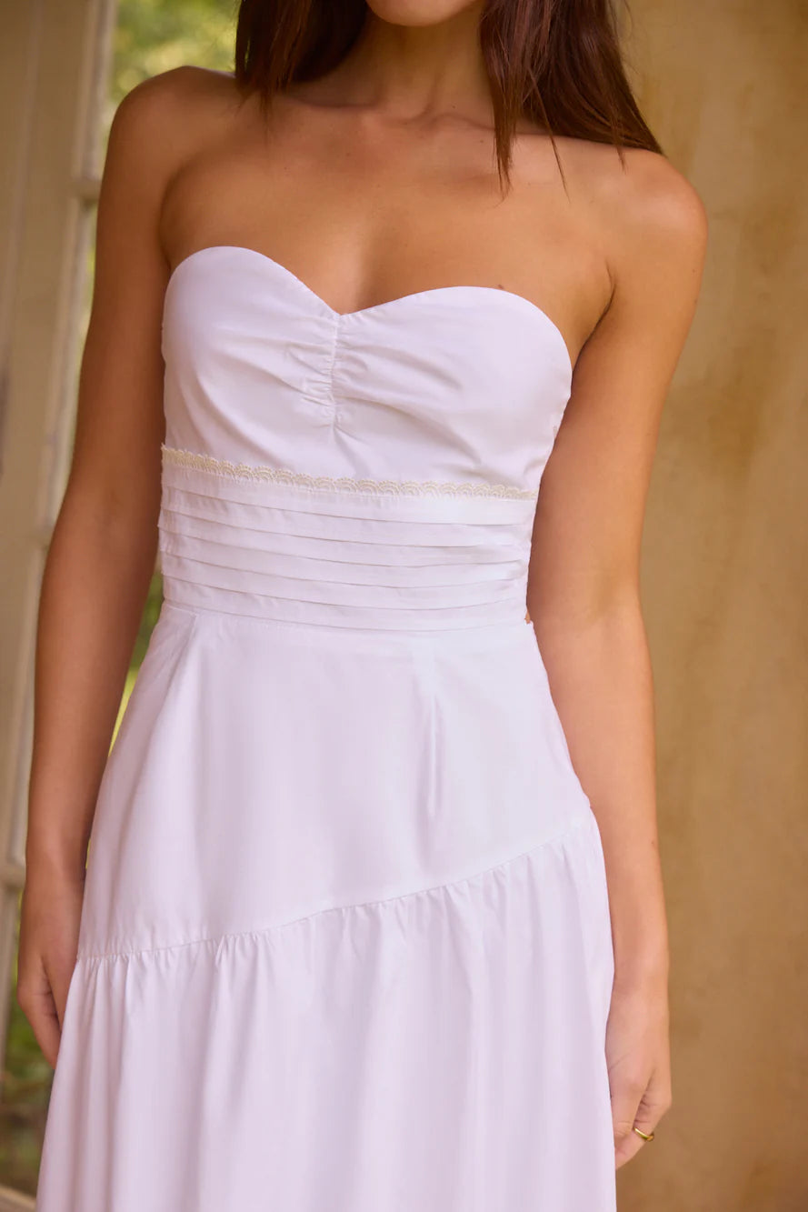 Embrace effortless romance in the Seaside Picnic Midi Dress White, a dreamy piece designed for sunlit strolls and golden-hour gatherings. Featuring a strapless sweetheart neckline with delicate ruched detailing, this dress exudes feminine charm. The fitted bodice flows into a breezy, tiered midi skirt, offering graceful movement with every step. Crafted from soft, lightweight fabric, it’s the perfect addition to your warm-weather wardrobe.
