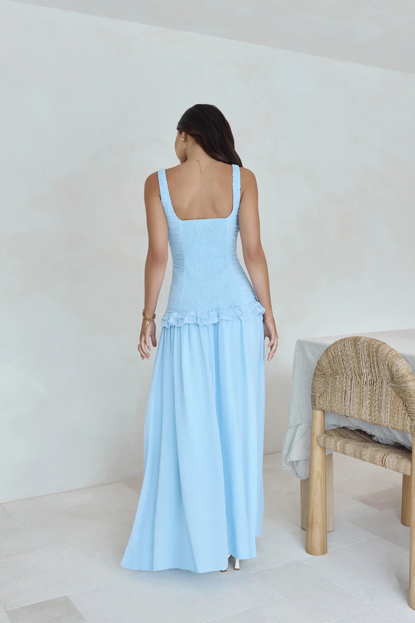 Romantic and flowy, the Shoreline Luxe Maxi Dress is your invitation to shine. Designed with a sweet frill trim, this piece keeps things effortlessly pretty. Style with dainty heels, glowy skin, and a playful clutch.
