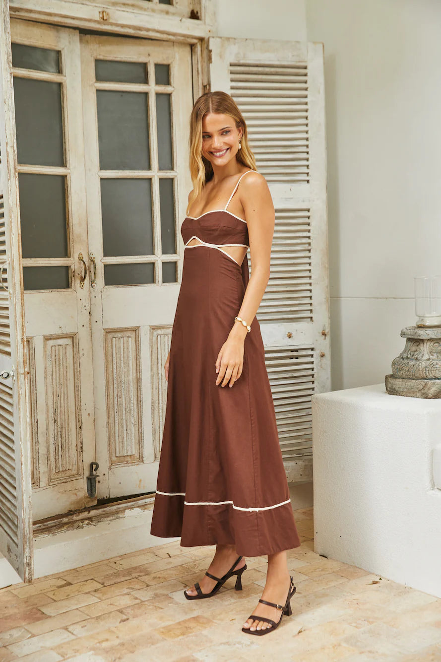 Step into effortless elegance with the Sienna Breeze Maxi Dress in Chocolate Beige. Designed for sun-soaked escapes and dreamy evenings, this dress features a fitted bodice with delicate contrast piping and a subtle cutout detail for a modern touch. The flowy A-line skirt moves gracefully with every step, making it perfect for coastal getaways, garden brunches, or sunset strolls.