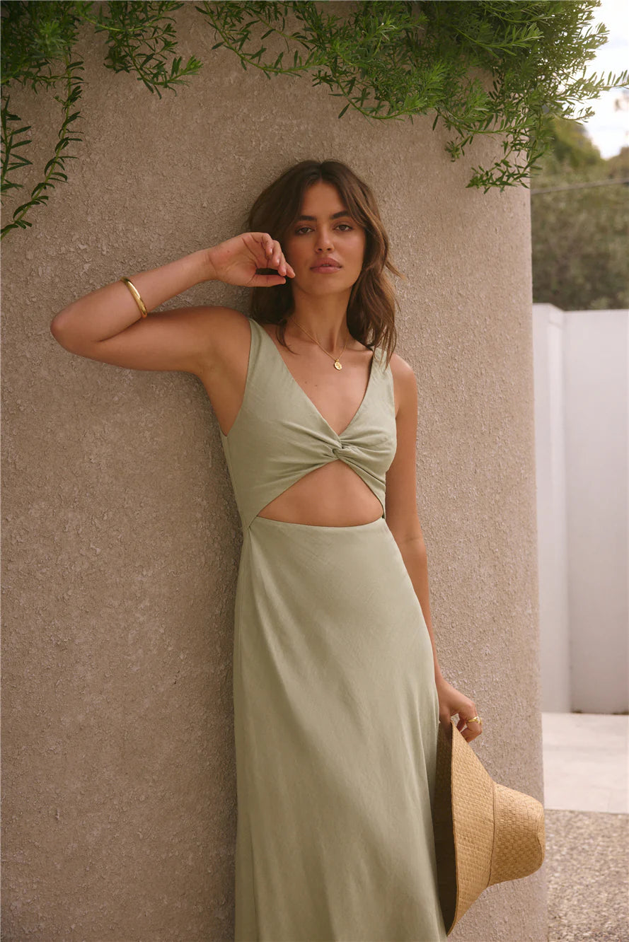 Explore the architecture around you on a summer's day in the Soft Silhouette Maxi Dress in Sage. Pair this dress with white strappy heels and loose waves to achieve an angelic and chic look.