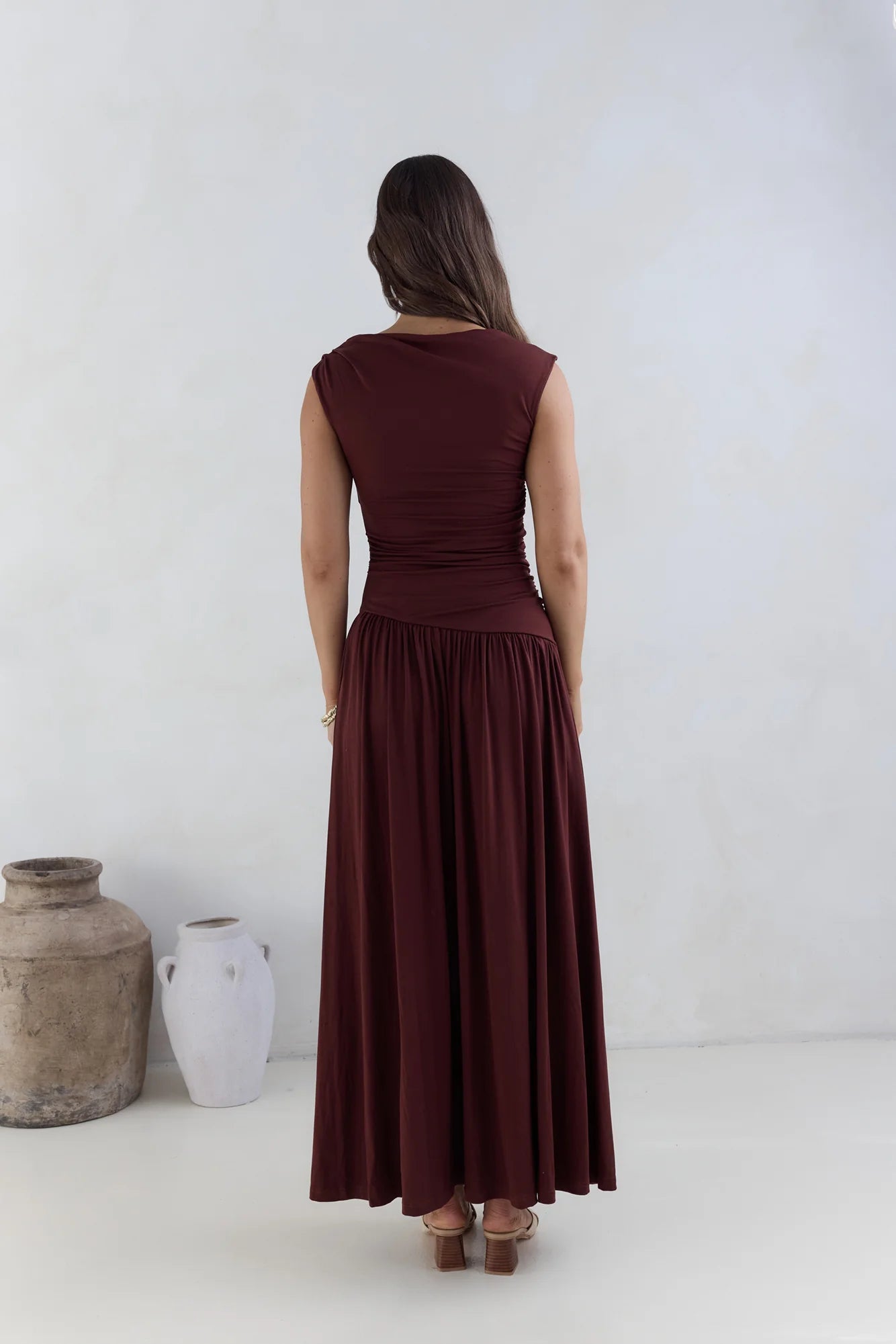 Chase sunsets in the Soluna Maxi Dress Brown. With a soft stretch fit, round neckline, and dreamy flowy skirt, this maxi is made for golden hour adventures. Your perfect plus-one from coastlines to cobblestones.