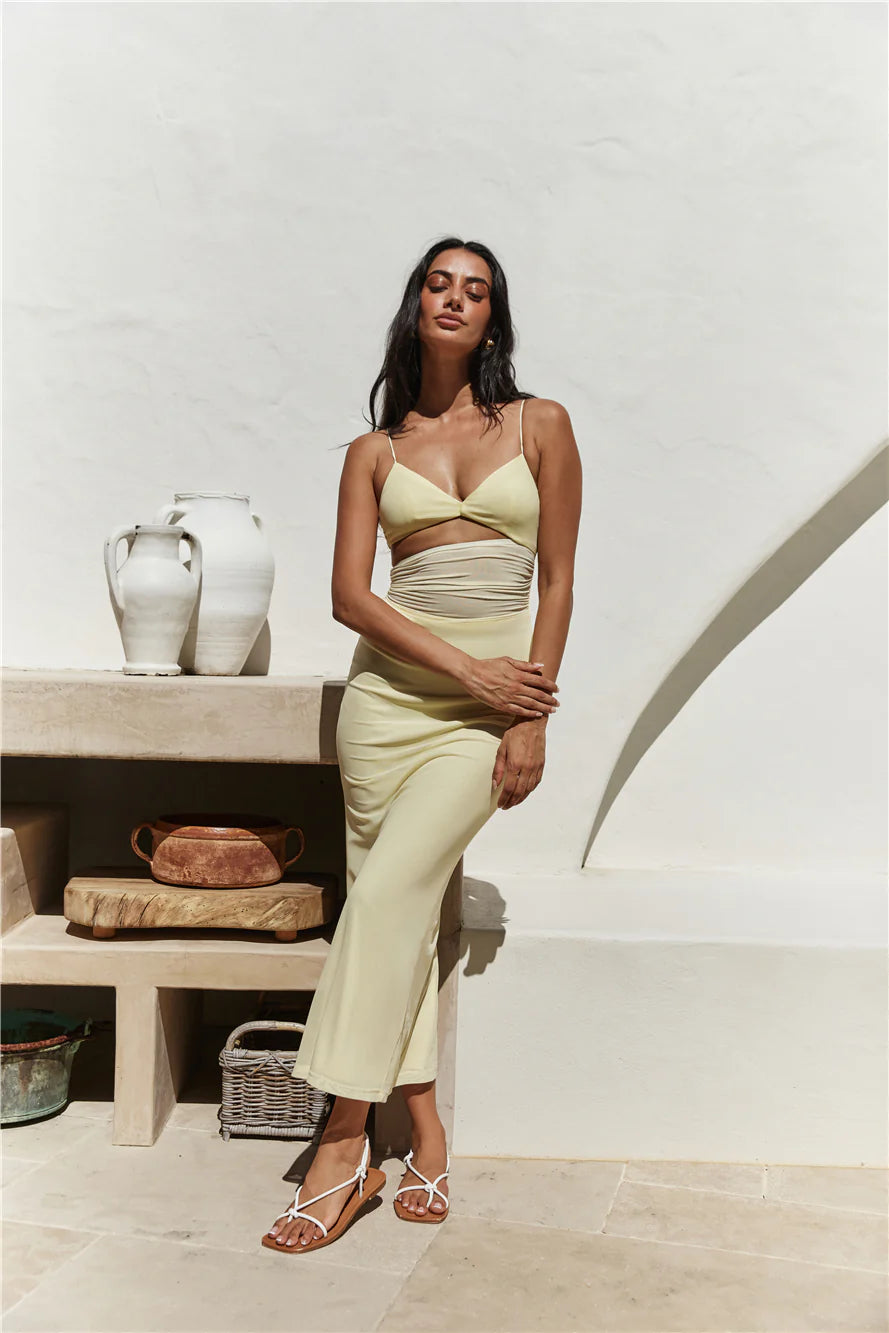 Summer Nomad Midi Dress in Yellow, radiates effortless summer elegance in a soft pastel yellow. Designed with a delicate twist-front bust and a sheer ruched waist panel, this dress accentuates your silhouette with a touch of allure. The figure-skimming fit flows into a sleek maxi length, creating an elongated and sophisticated look. Crafted from a lightweight stretch fabric, it hugs the body in all the right places while ensuring comfort.
