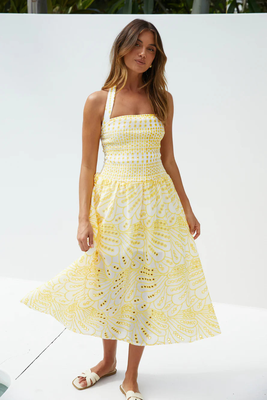 Bask in the glow of sunshine with the radiant Sunlit Shores Maxi Dress. Featuring a chic square neckline with a delicate neck strap, this dress effortlessly combines style and comfort. The elastic center design adds a flattering touch, while the intricate eyelet detailing throughout exudes a timeless charm.