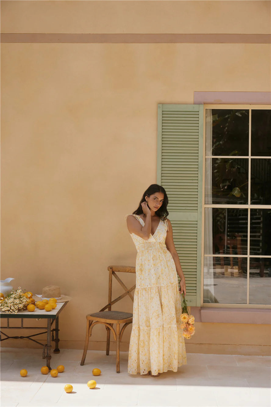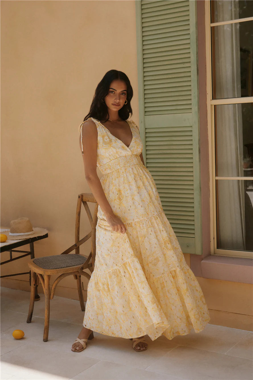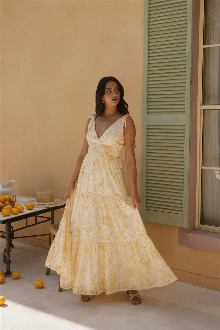 Sunshine in the form of a dress. That's exactly how you will feel wearing The Sunny Splendor maxi dress. The perfect dress for any outdoor event during summer and spring. The dress is so elevated on its own, that pairing with minimal accessories will complete this bright dress.