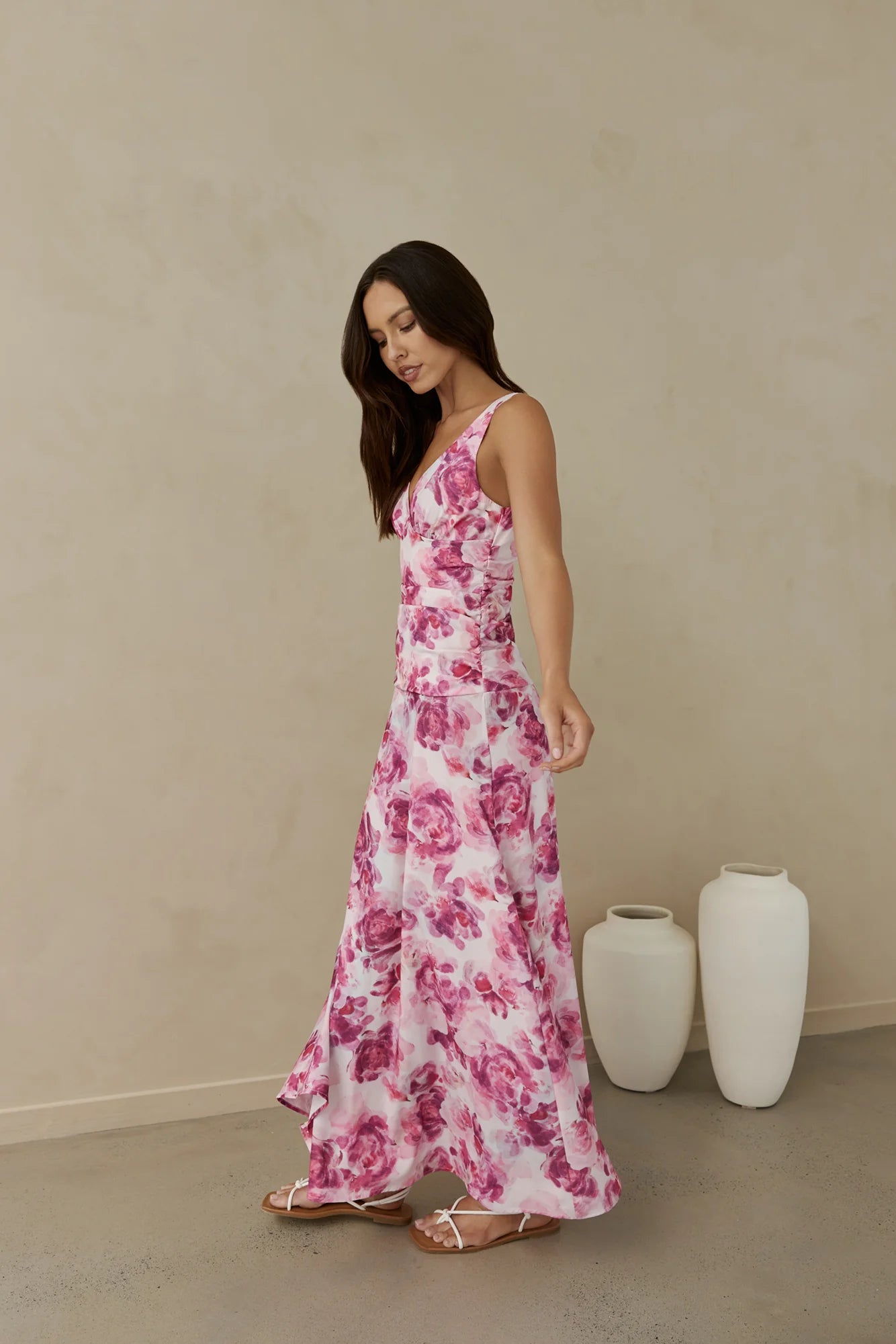 The Sunset Palette Maxi Dress was made for your next evening on a rooftop. Featuring a flattering V-neck and back with gathered details and a flowy skirt, perfect for dreamy sunset moments. Style with mules and gold jewellery.