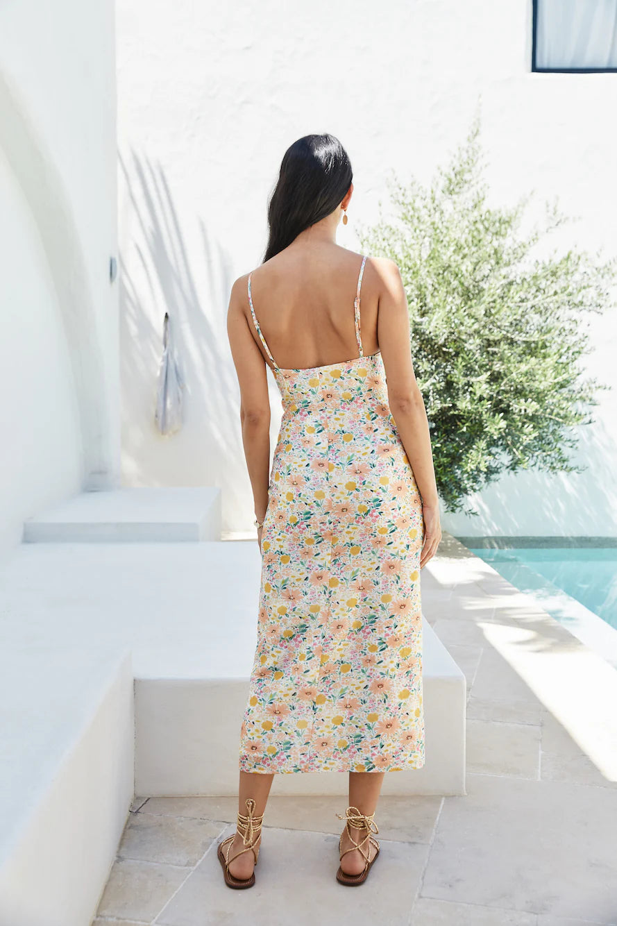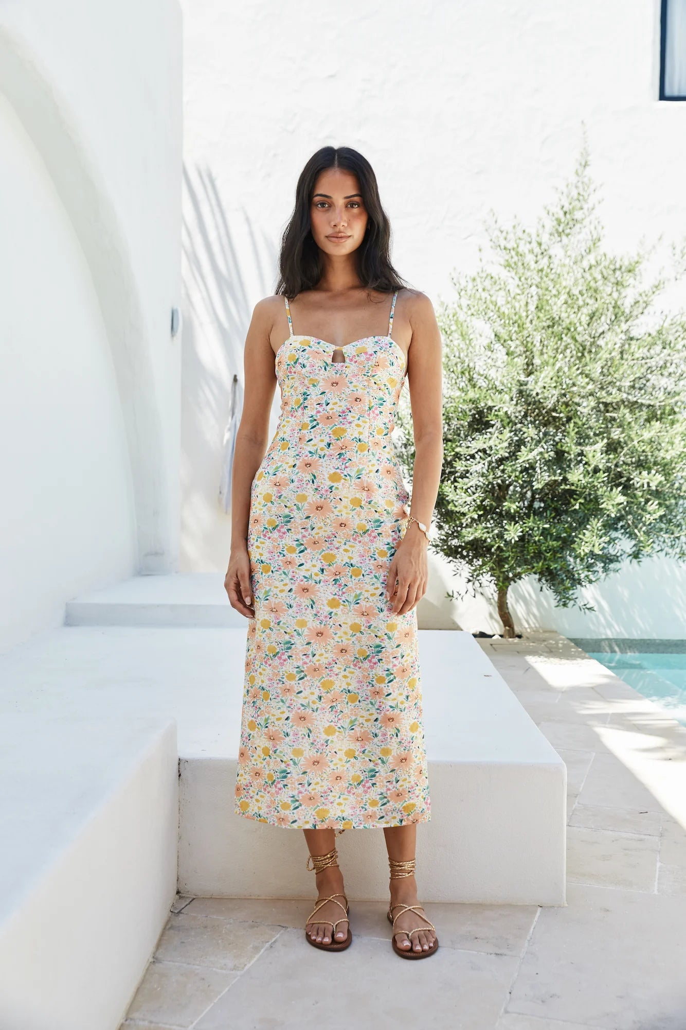 Sunset Promises Midi Dress Orange captures the essence of effortless femininity with its delicate floral print in soft pastel hues. Designed with a flattering fitted silhouette, it features a subtle keyhole detail at the bust and adjustable spaghetti straps for the perfect fit. The lightweight fabric drapes beautifully, making it an ideal choice for sunlit picnics, brunch dates, and dreamy getaways.