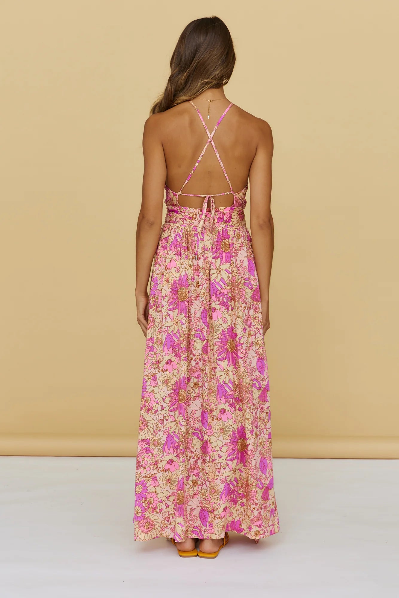 From dawn to dusk, the Sunset Shadows Maxi Dress will have you living the dream island life this summer! Style yours with lace-up sandals and gold adornments.