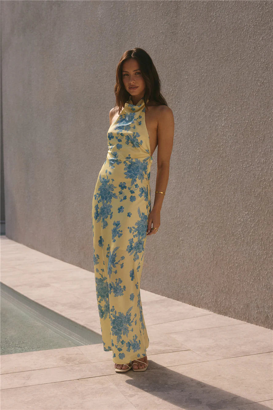 Drape yourself in the warm hues of the Sunset Skies Halter Maxi Dress in Yellow, perfect for watching the sun dip below the horizon on the idyllic beaches of Maui. Elevate with white heels and gold adornments.