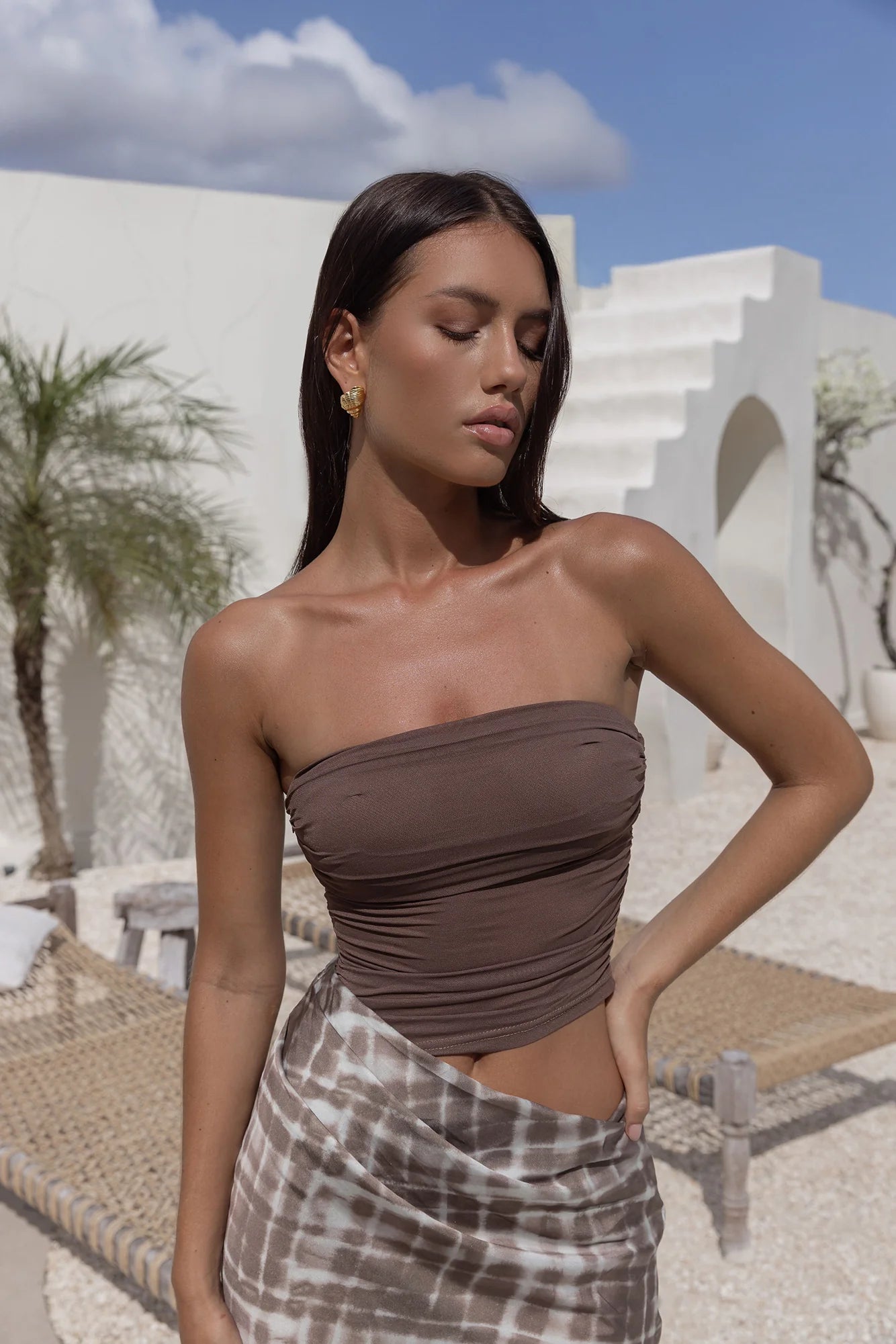 Make a statement in the Sunset Voyager Maxi Dress Brown, featuring a stretch mesh top with a sheer bodice, strapless neckline, a cutout at the waist, and a luxe satin skirt that flows with every step.
