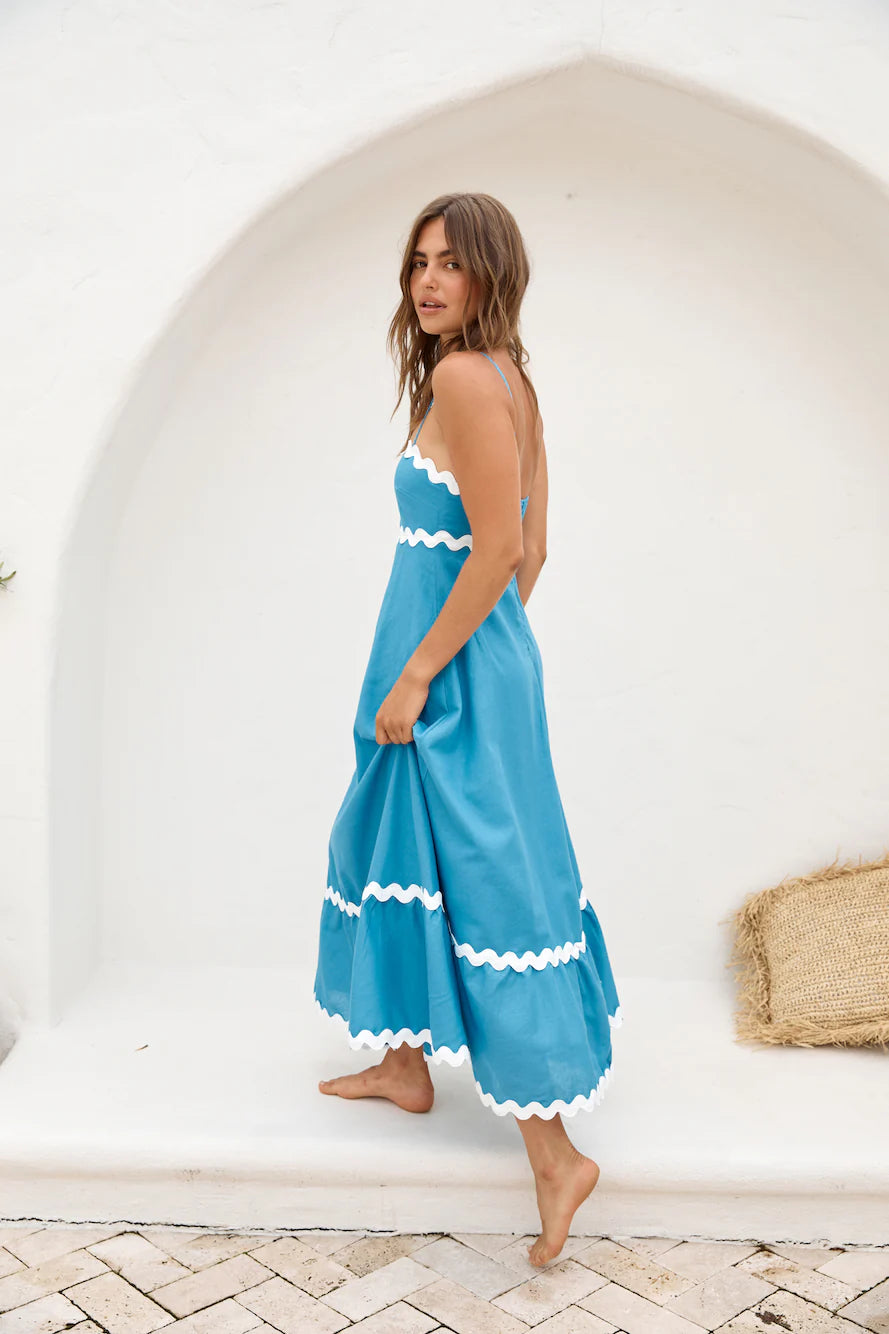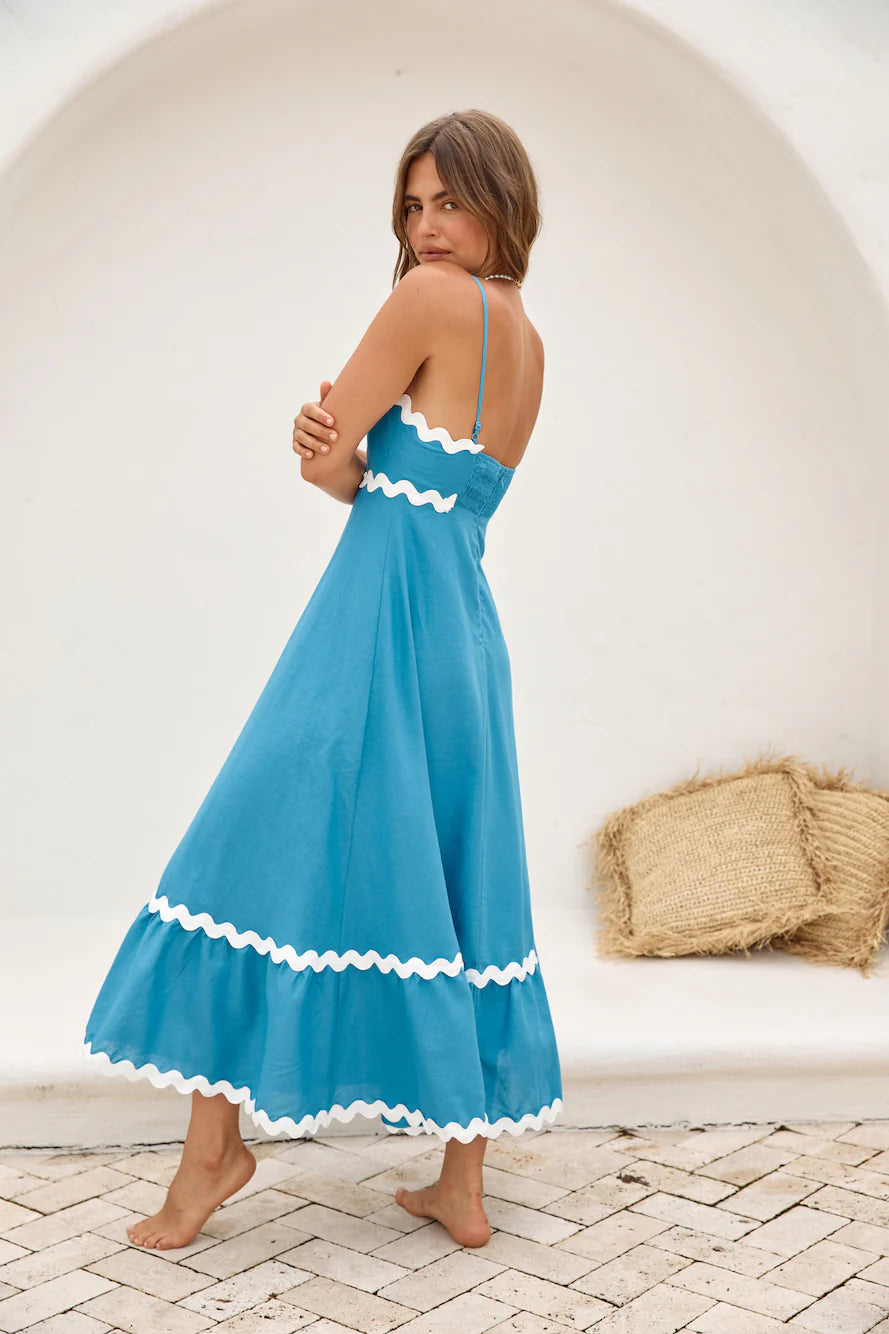 Enjoy your European summer with the Sweet Devotion Maxi Dress in Blue. This flowy dress was designed for life's unexpected yet magical moments. Style with slip-on sandals and loose waves to complete the look.
