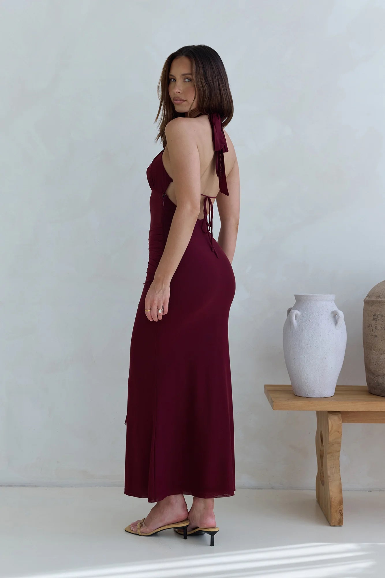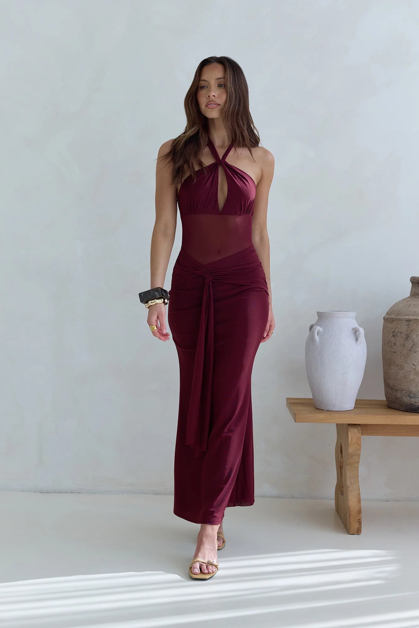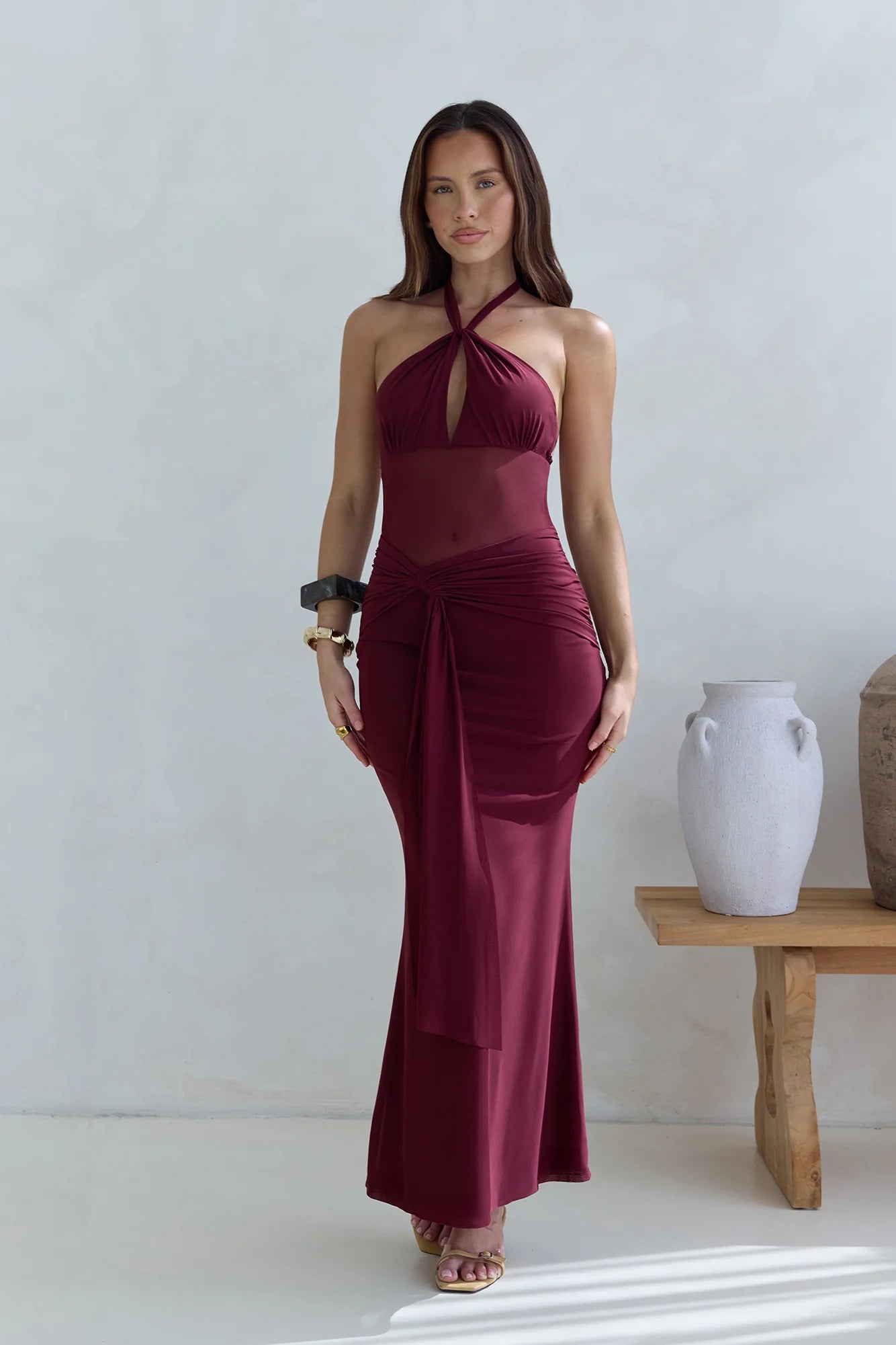 Turn heads in the Taste Of Luxe Halter Mesh Maxi Dress, a statement style made to stand out. With a statement halter neckline, sheer bodice, flowy skirt and detailing to the waist. Pair with mules and gold adornments.