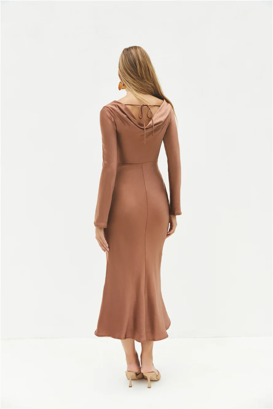 The Forget Me Not Satin Maxi Dress in Brown combines timeless elegance with modern flair, perfect for garden weddings in the English countryside or sophisticated soirées in a Tuscan villa. Embrace the romance of summer with this enchanting dress, designed to leave a lasting impression.