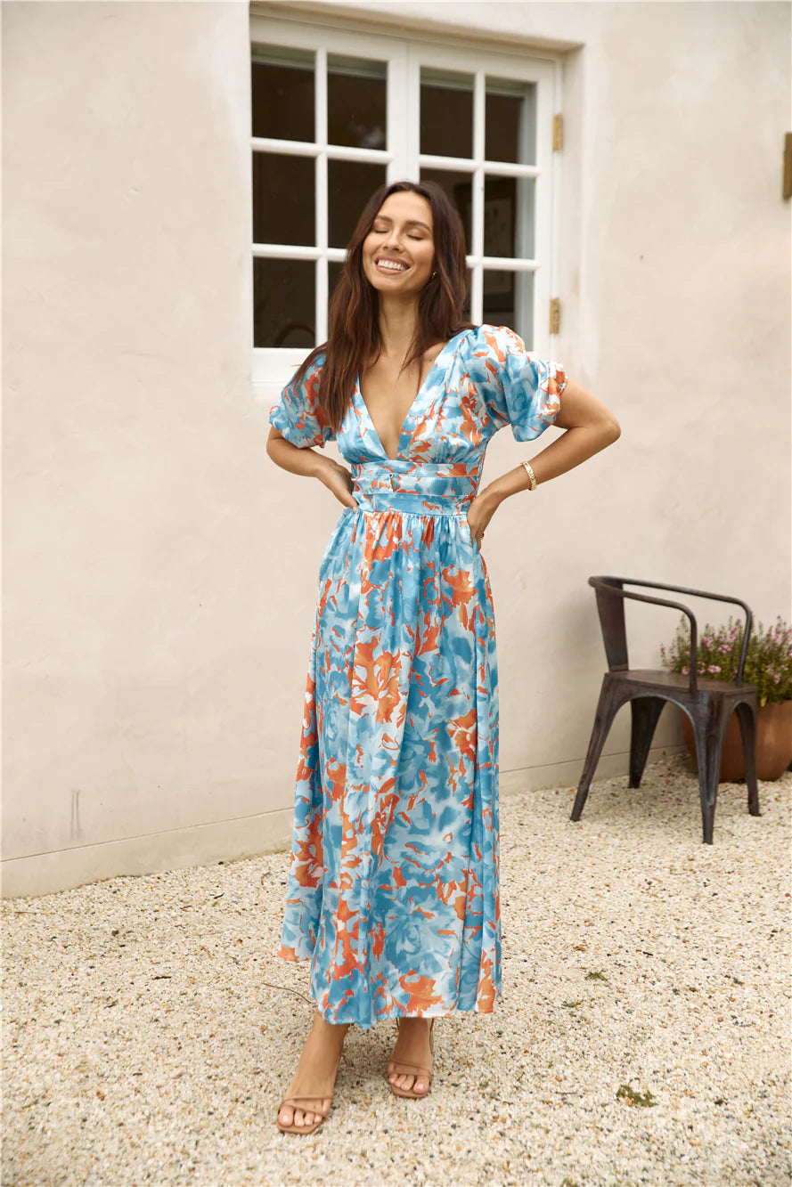 Introducing the Through Oceans Satin Maxi Dress in Blue: a timeless piece for dreamy escapes. Whether strolling along the shores of the Amalfi Coast or attending a seaside soirée, this dress captures the essence of oceanic elegance, ensuring you make waves wherever you wander.