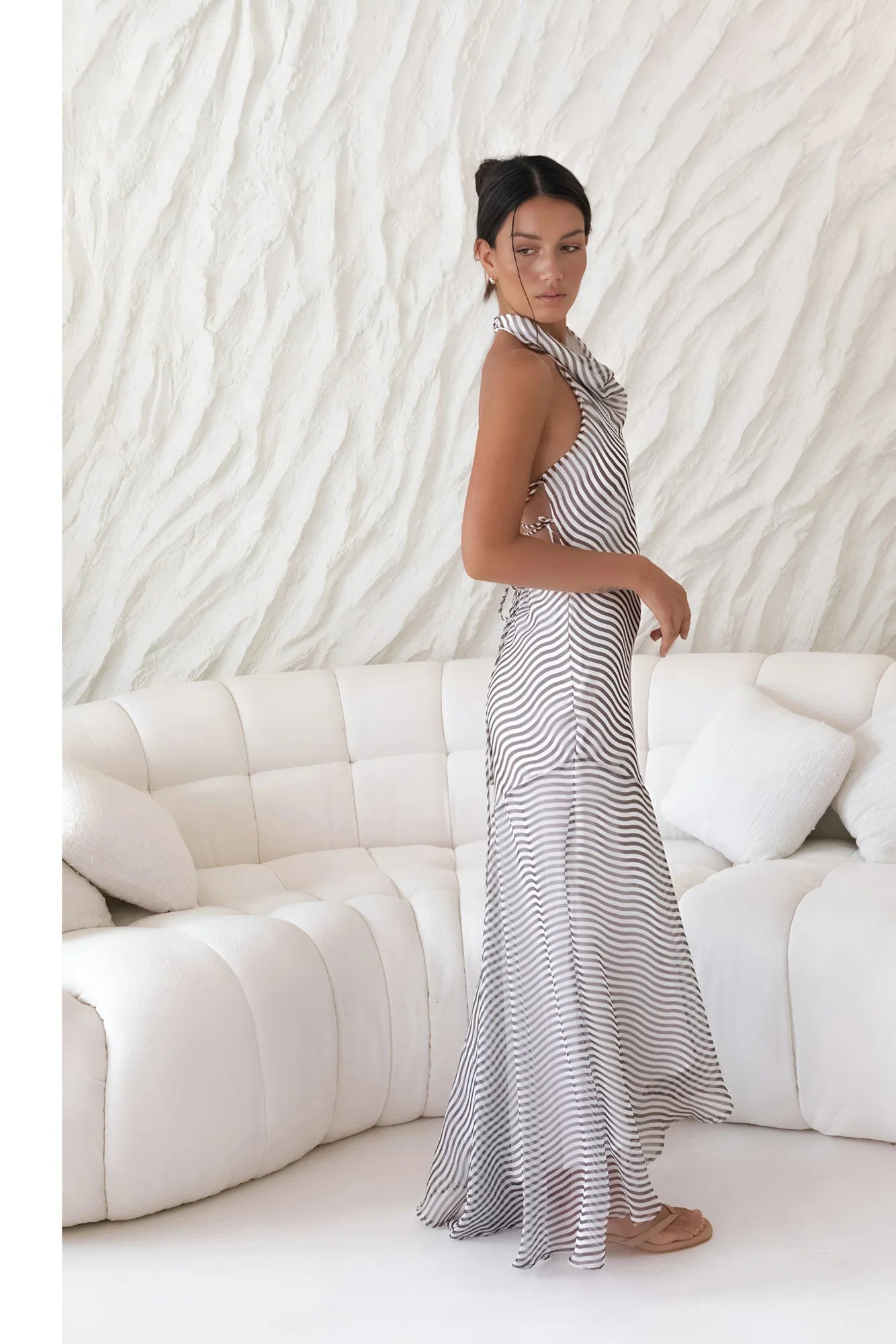 Embrace the flow of effortless style with the Tidal Wave Maxi. This halter-neck dress features hypnotic wavy stripes in a soft monochrome palette, creating a striking yet timeless look. The draped cowl neckline offers a touch of sophistication, while the asymmetrical hemline brings playful movement to every step.