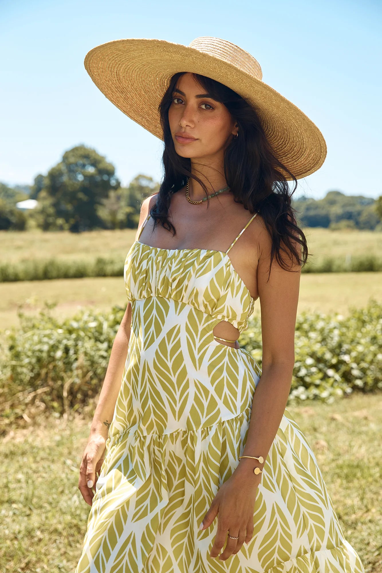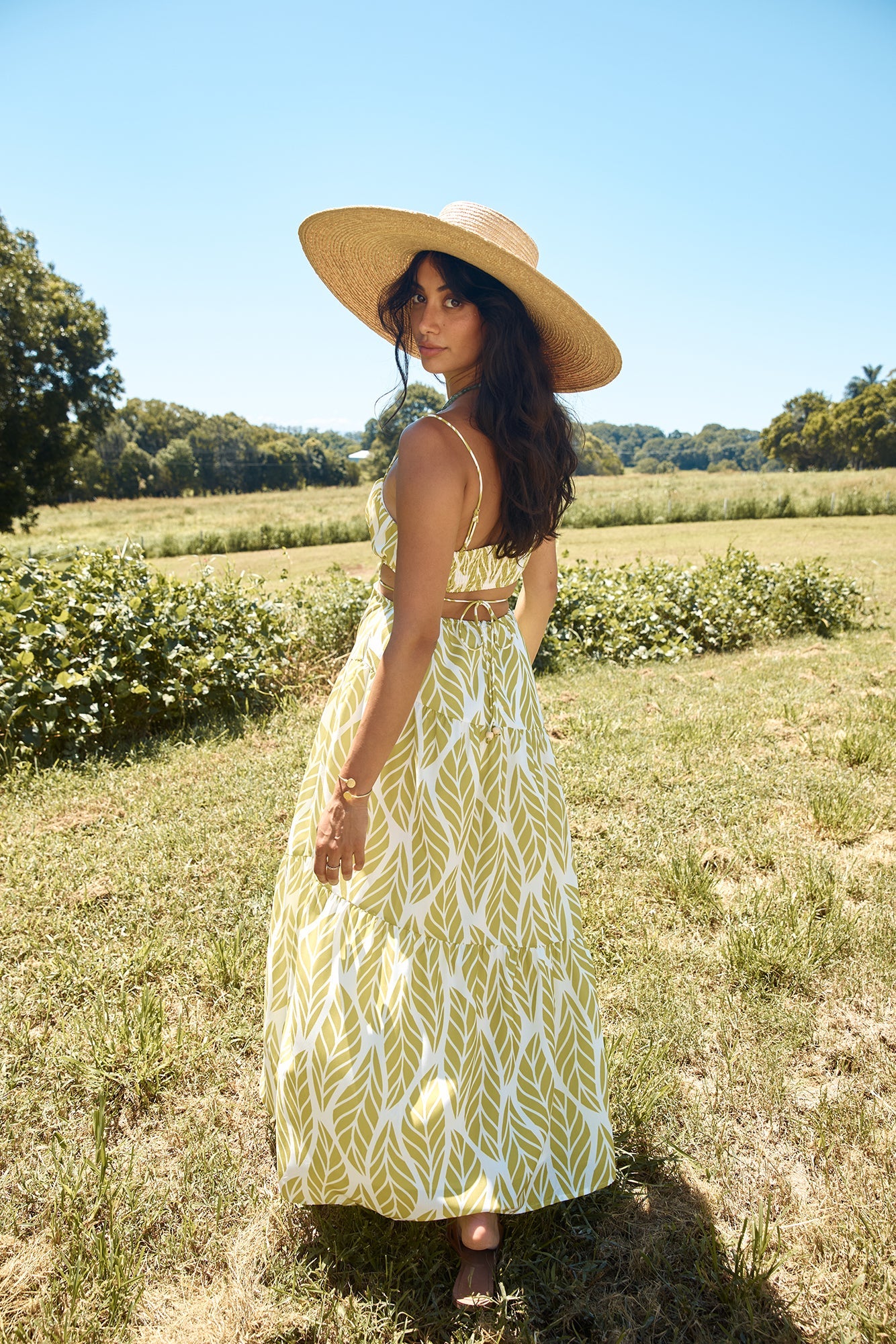 Embark on a journey through tropical splendor with the Tropic Trails Maxi Dress in Green, a radiant and flowing attire that mirrors the sunlit trails of exotic paradises, ensuring you embody the vibrant spirit of summer wherever you go. Style this piece with tan sandals and gold adornments to elevate.