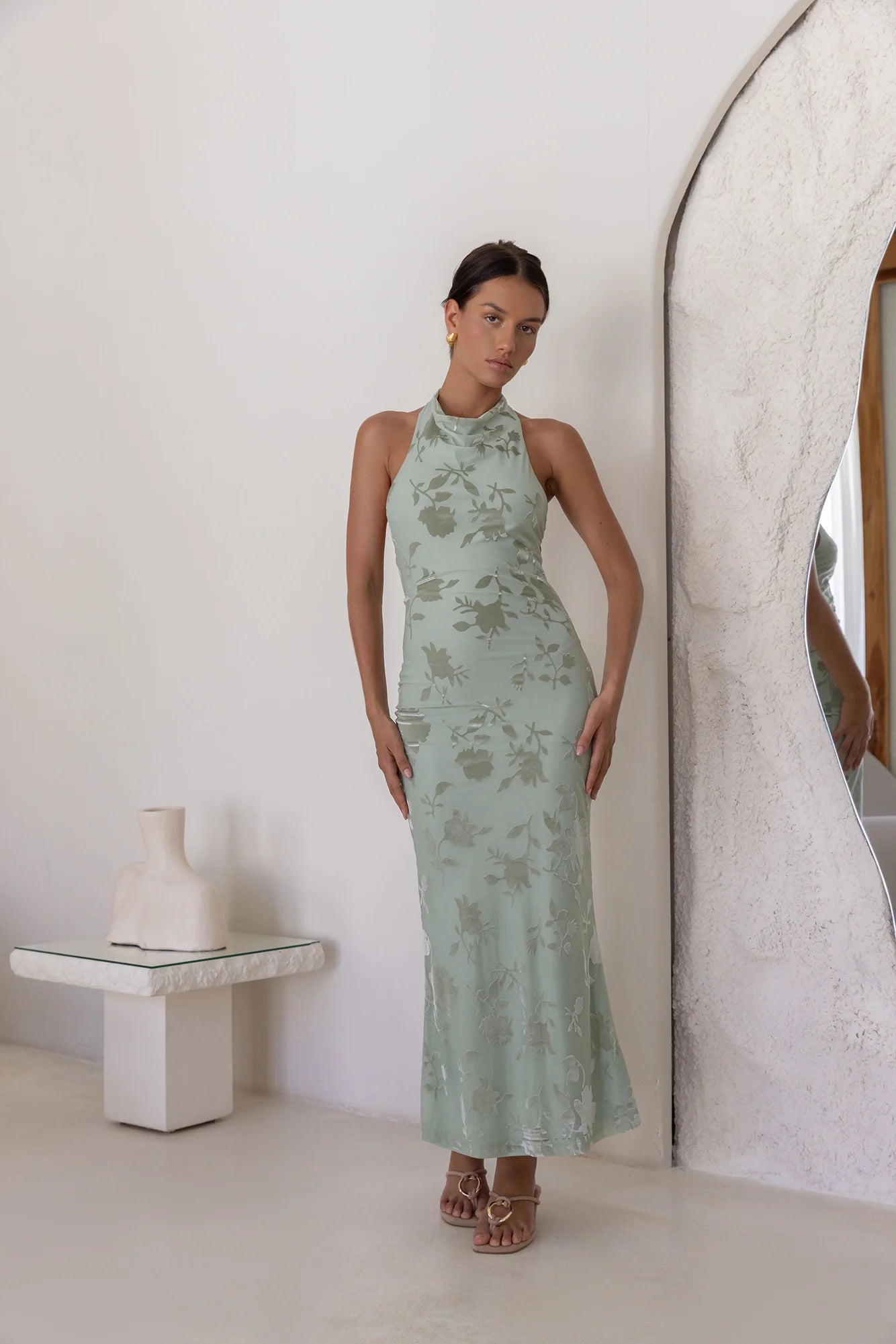Turn heads in the Tropic Whisper Maxi Dress Sage, featuring stretch mesh, a halter neckline, and a playful print—perfect for summer soirées or stylish daytime events.