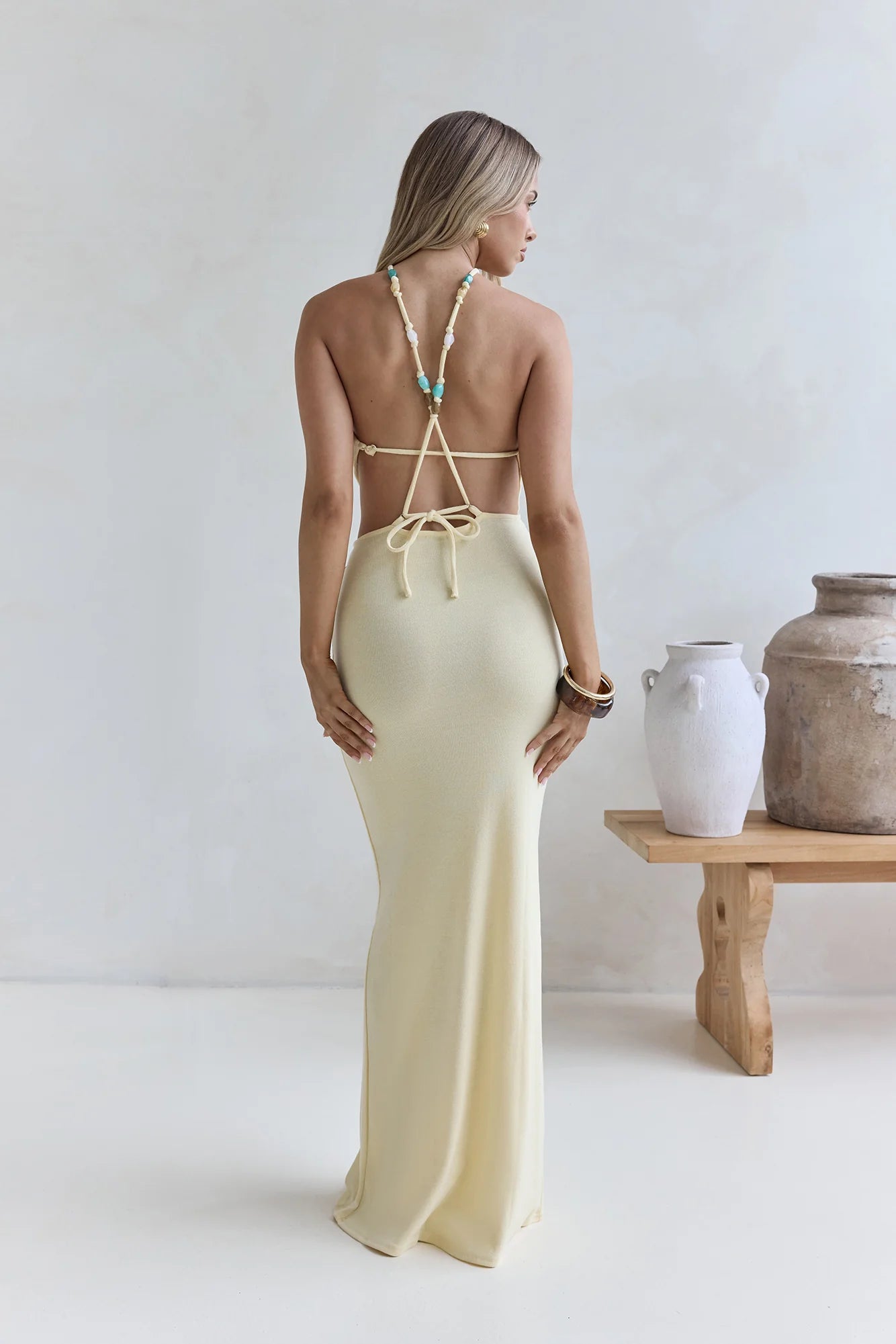 The Tropiluxe Maxi Dress is made from stretch knit, designed with a cutout at the waist, an open back, beaded shoulder straps, and a tie-back closure—perfect for pairing with strappy heels and a statement clutch for a chic, effortless look.
