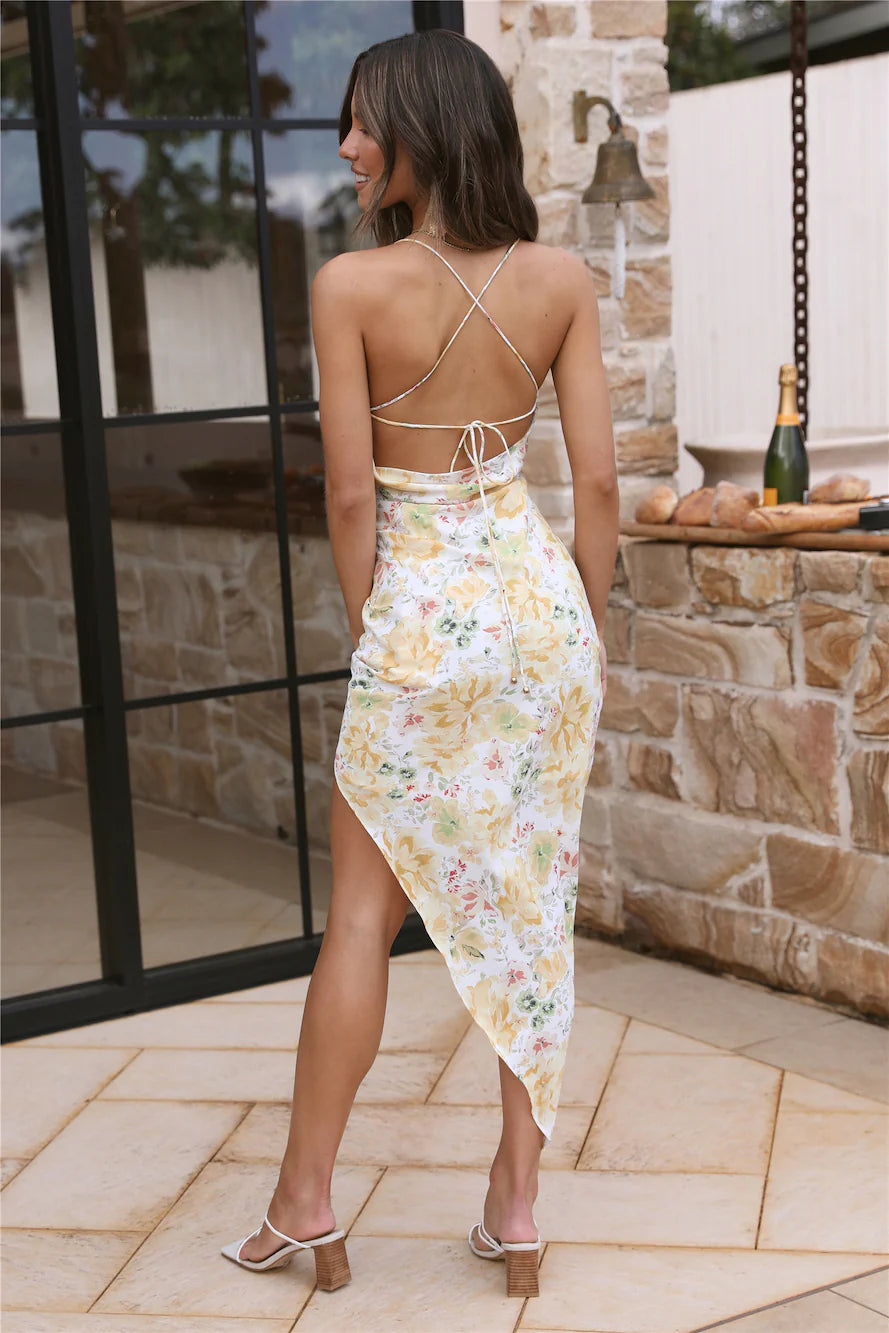 The Under The Clouds Midi Dress will make you feel like spring is in full bloom. Style yours with neutral block heels and gold adornments.