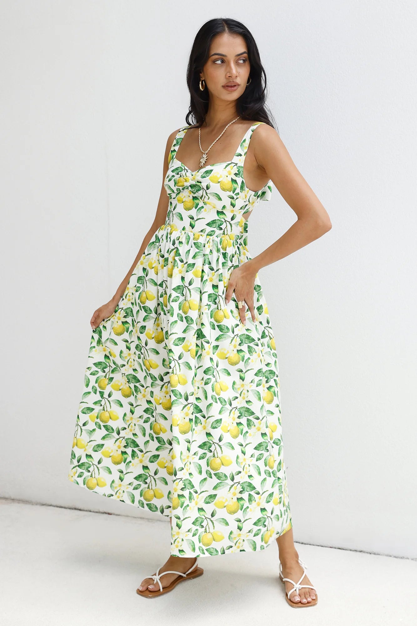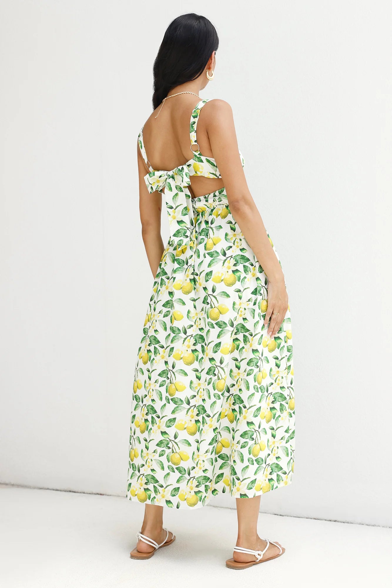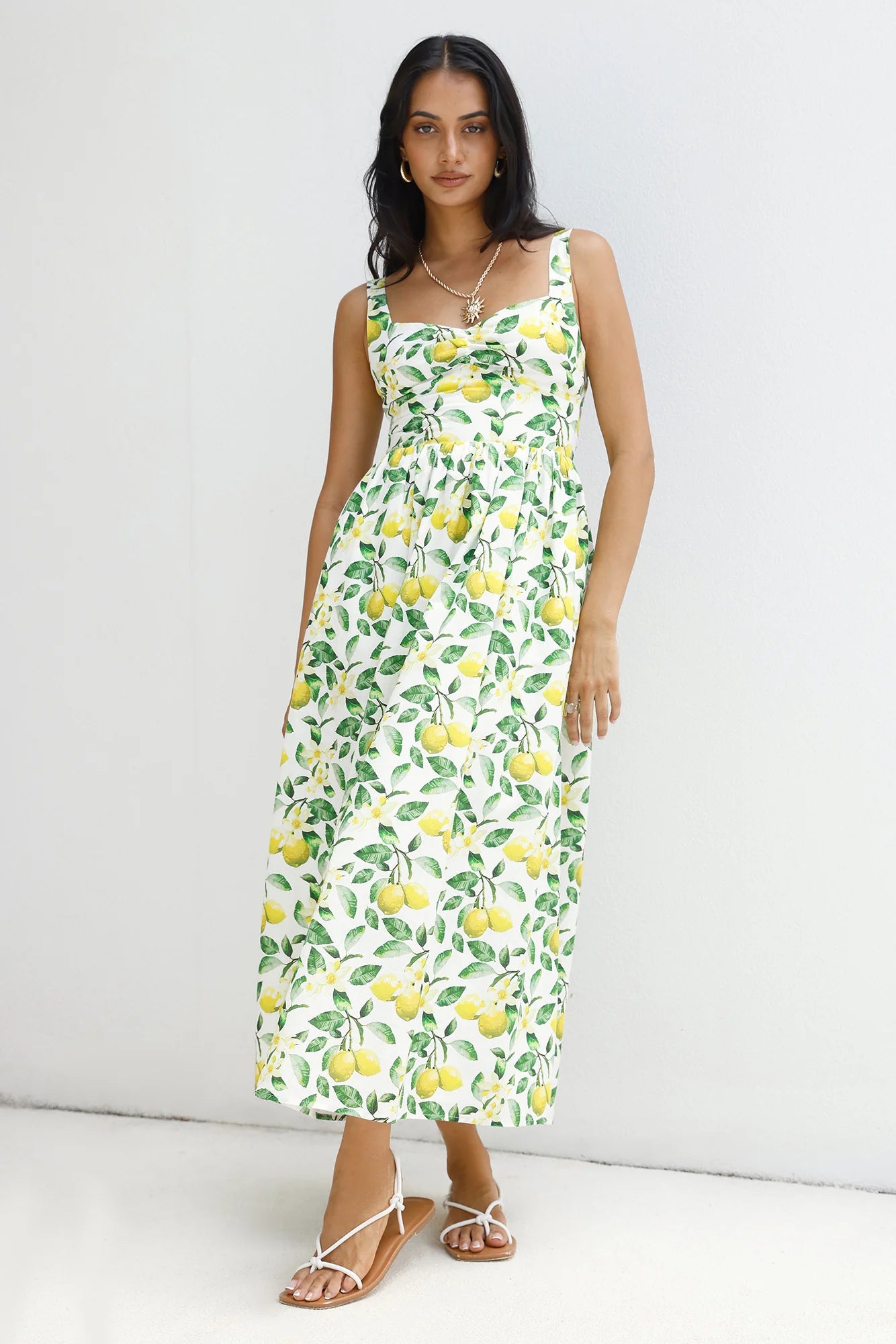 Bask in the charm of the Italian Riviera with the Under the Lemon Tree Midi Dress in Print. Designed in a sun-soaked lemon print, this dress embodies effortless elegance with its structured bodice, sweetheart neckline, and wide shoulder straps for a flattering, feminine fit.