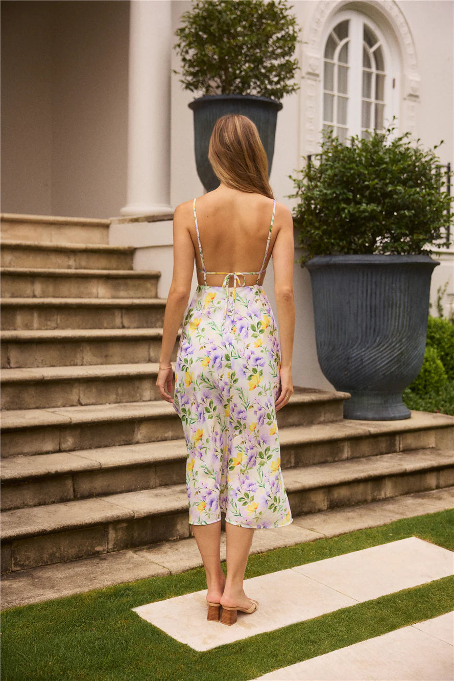 Step into effortless elegance with the Vivid Garden Midi Dress in Purple. Featuring a chic high neckline and a flattering midi silhouette, this dress boasts a bold leg slit for added movement and charm. The open-back design with cross detailing adds a playful yet sophisticated touch, making it a standout choice for any occasion.