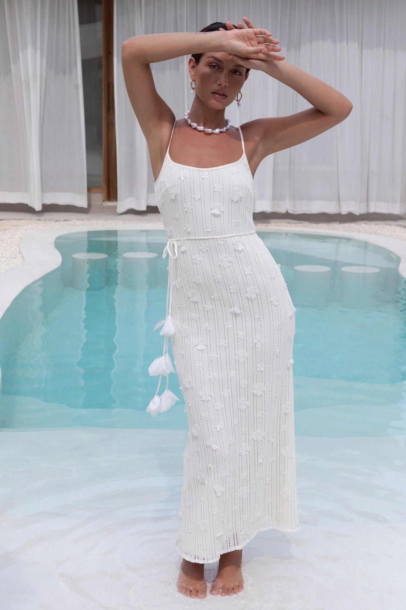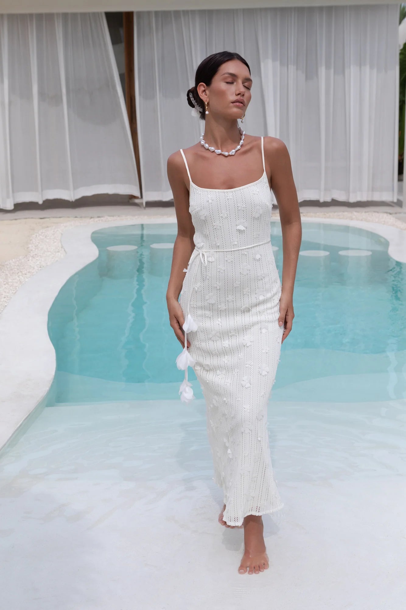 The Whispering Petals Knit Midi Dress Cream is a dreamy blend of delicacy and bohemian charm. This ethereal cream knit dress features soft, 3D floral appliqués cascading down its lightweight, open-knit fabric, creating a whimsical texture that catches the eye. The dainty spaghetti straps and subtle scoop neckline add a touch of effortless elegance, while soft petal accents along the side bring a playful movement to the silhouette.