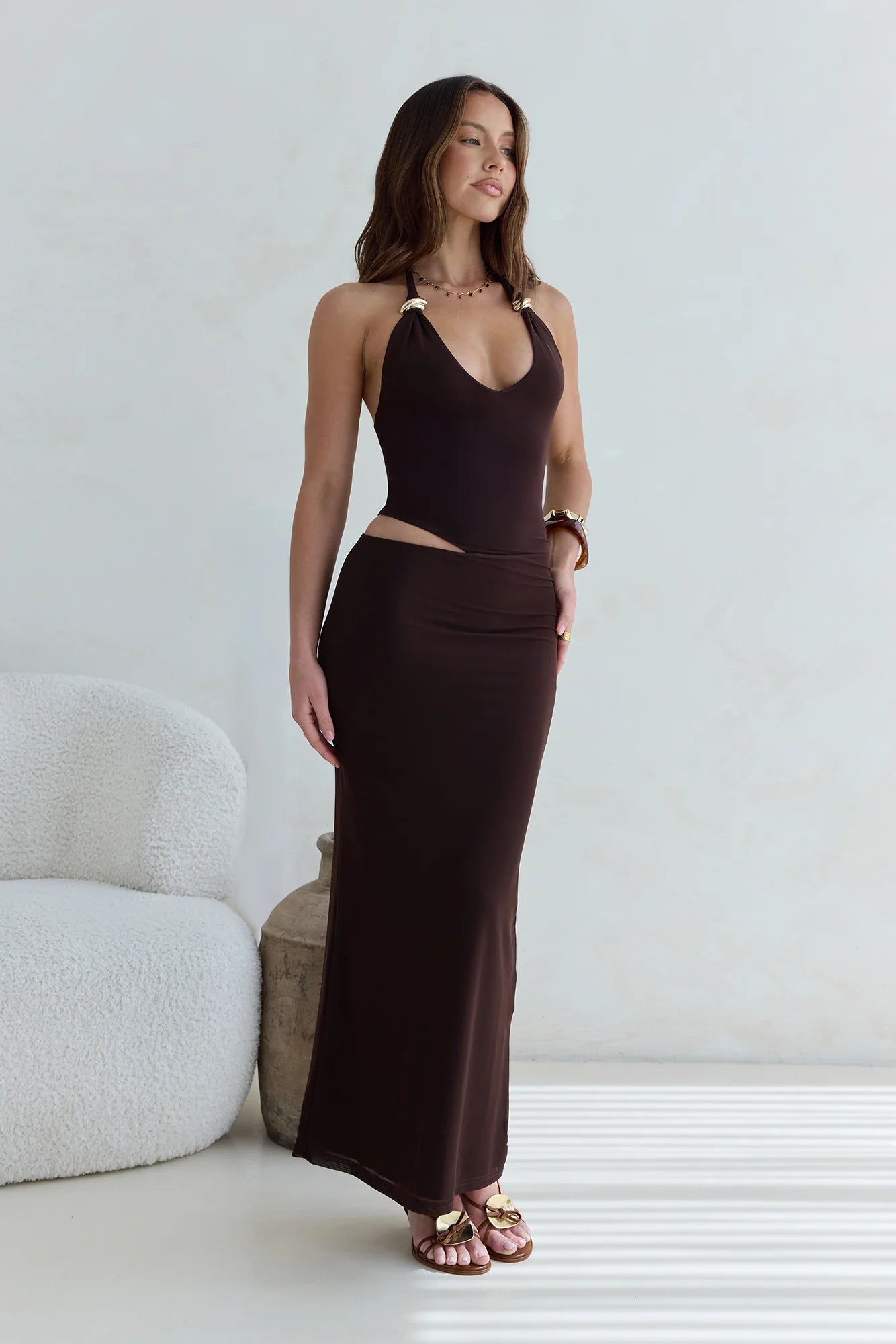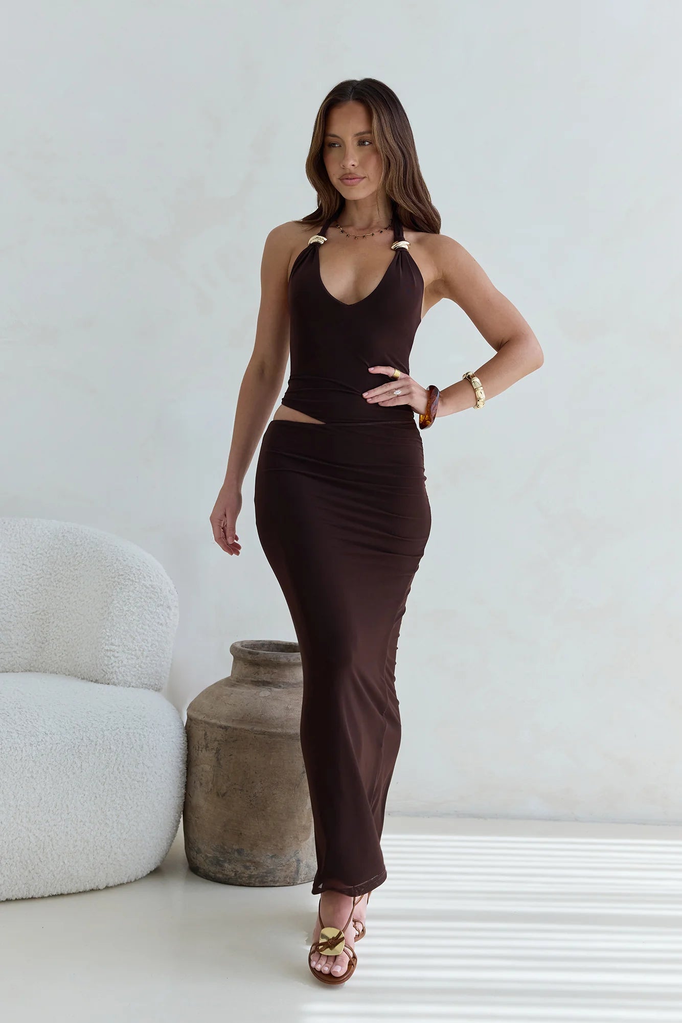 A statement silhouette made for the lovers the Whispers In The Dark Halter Mesh Maxi Dress will have you turning heads wherever you go. Featuring a fitted silhouette, hardware detailing to the halter straps and a bold cutout at the waist. Style with mules and gold adornments.