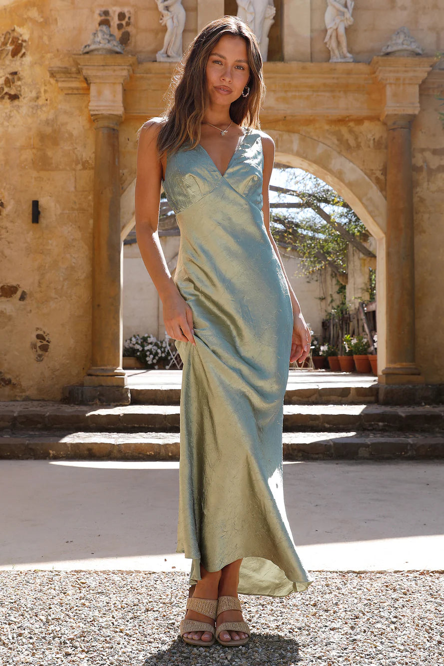 Experience a youthful glow from the bright sun in the Young Folks Satin Maxi Dress in Sage. This dress if perfect for relaxed day time adventures or for dressing up for night time events. We'll be pairing ours with tan heels and gold adornments.